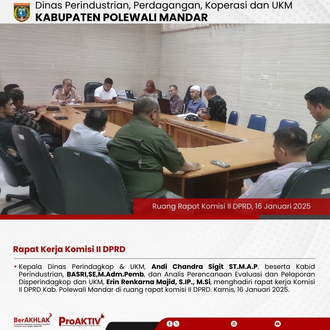 Kepala Dinas Perindagkop & UKM, Andi Chandra Sigit ST.M.A.P. beserta Kabid Perindustrian, BASRI,SE,M.Adm.Pemb, dan Analis Perencanaan Evaluasi dan Pelaporan Disperindagkop dan UKM, Erin Renkarna Majid, S.IP., M.Si, menghadiri rapat kerja Komisi II DPRD Kab. Polewali Mandar di ruang rapat komisi II DPRD. Kamis, 16 Januari 2025....