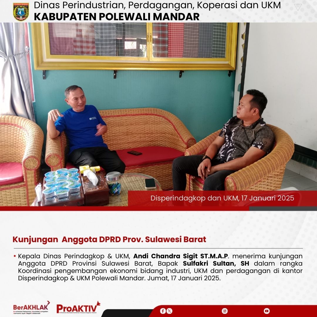 Kepala Dinas Perindagkop & UKM, Andi Chandra Sigit ST.M.A.P. menerima kunjungan Anggota DPRD Provinsi Sulawesi Barat, Bapak Sulfakri Sultan, SH dalam rangka Koordinasi pengembangan ekonomi bidang industri, UKM dan perdagangan di kantor Disperindagkop & UKM Polewali Mandar. Jumat, 17 Januari 2025....