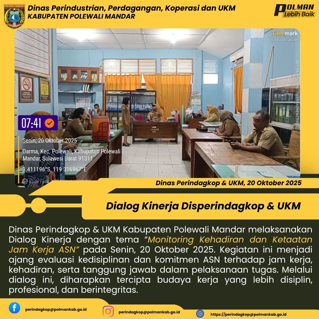 Dinas Perindagkop & UKM Kabupaten Polewali Mandar melaksanakan Dialog Kinerja dengan tema “Monitoring Kehadiran dan Ketaatan Jam Kerja ASN” pada Senin, 20 Oktober 2025. Kegiatan ini menjadi ajang evaluasi kedisiplinan dan komitmen ASN terhadap jam kerja, kehadiran, serta tanggung jawab dalam pelaksanaan tugas. Melalui dialog ini, diharapkan tercipta budaya kerja yang lebih disiplin, profesional, dan berintegritas....
