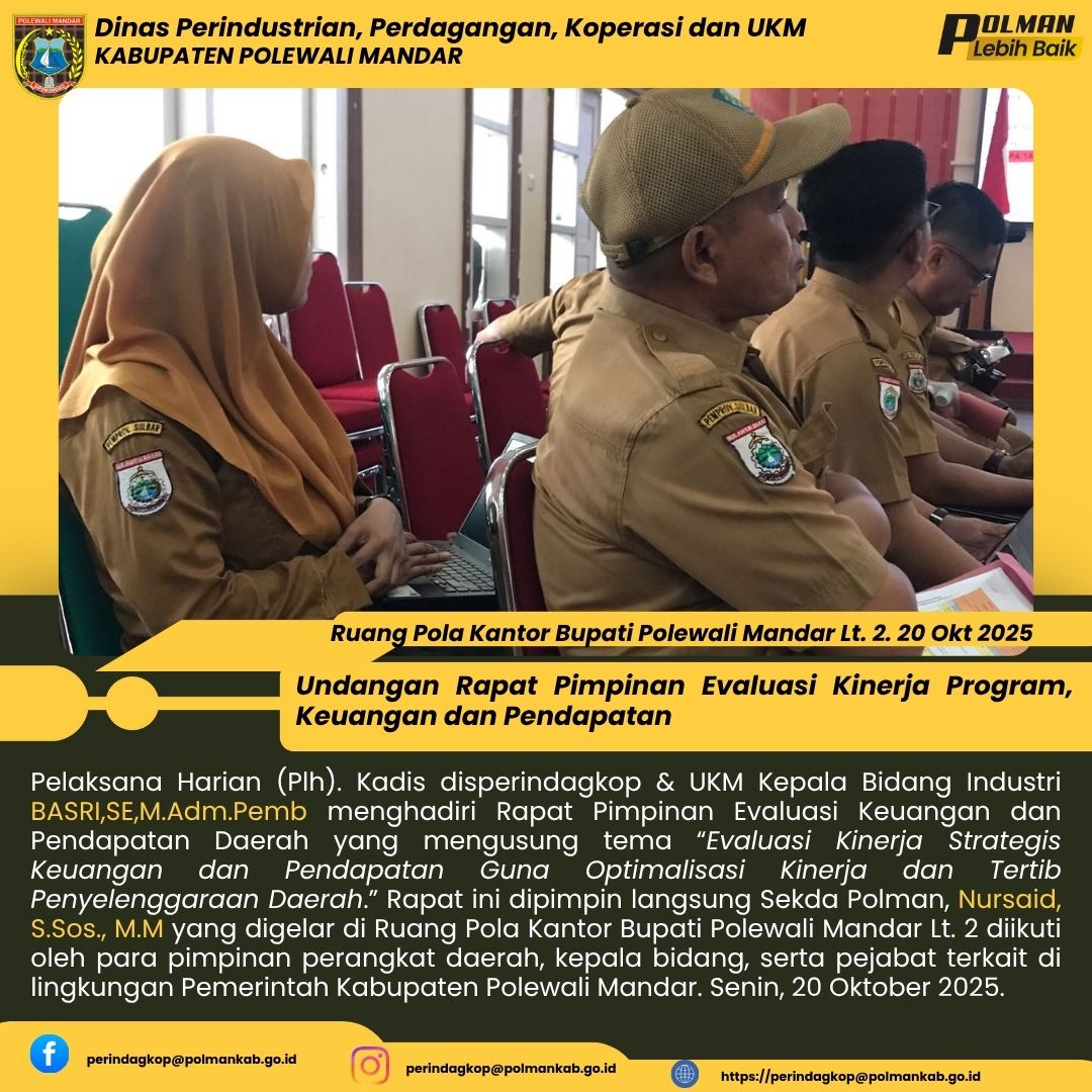 Pelaksana Harian (Plh). Kadis disperindagkop & UKM Kepala Bidang Industri BASRI,SE,M.Adm.Pemb menghadiri Rapat Pimpinan Evaluasi Keuangan dan Pendapatan Daerah yang mengusung tema “Evaluasi Kinerja Strategis Keuangan dan Pendapatan Guna Optimalisasi Kinerja dan Tertib Penyelenggaraan Daerah.” Rapat ini dipimpin langsung Sekda Polman, Nursaid, S.Sos., M.M yang digelar di Ruang Pola Kantor Bupati Polewali Mandar Lt. 2 diikuti oleh para pimpinan perangkat daerah, kepala bidang, serta pejab...
