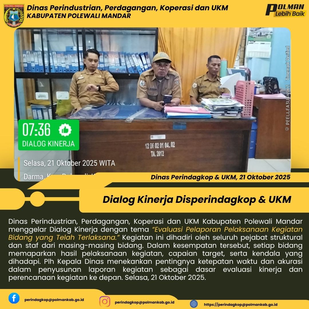 Dinas Perindustrian, Perdagangan, Koperasi dan UKM Kabupaten Polewali Mandar menggelar Dialog Kinerja dengan tema “Evaluasi Pelaporan Pelaksanaan Kegiatan Bidang yang Telah Terlaksana.” Kegiatan ini dihadiri oleh seluruh pejabat struktural dan staf dari masing-masing bidang. Dalam kesempatan tersebut, setiap bidang memaparkan hasil pelaksanaan kegiatan, capaian target, serta kendala yang dihadapi. Plh Kepala Dinas menekankan pentingnya ketepatan waktu dan akurasi dalam penyusunan laporan keg...