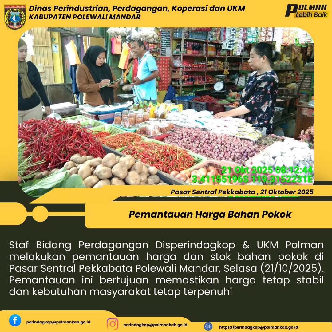 Staf Bidang Perdagangan Disperindagkop & UKM Polman melakukan pemantauan harga dan stok bahan pokok di Pasar Sentral Pekkabata Polewali Mandar, Selasa (21/10/2025). Pemantauan ini bertujuan memastikan harga tetap stabil dan kebutuhan masyarakat tetap terpenuhi...
