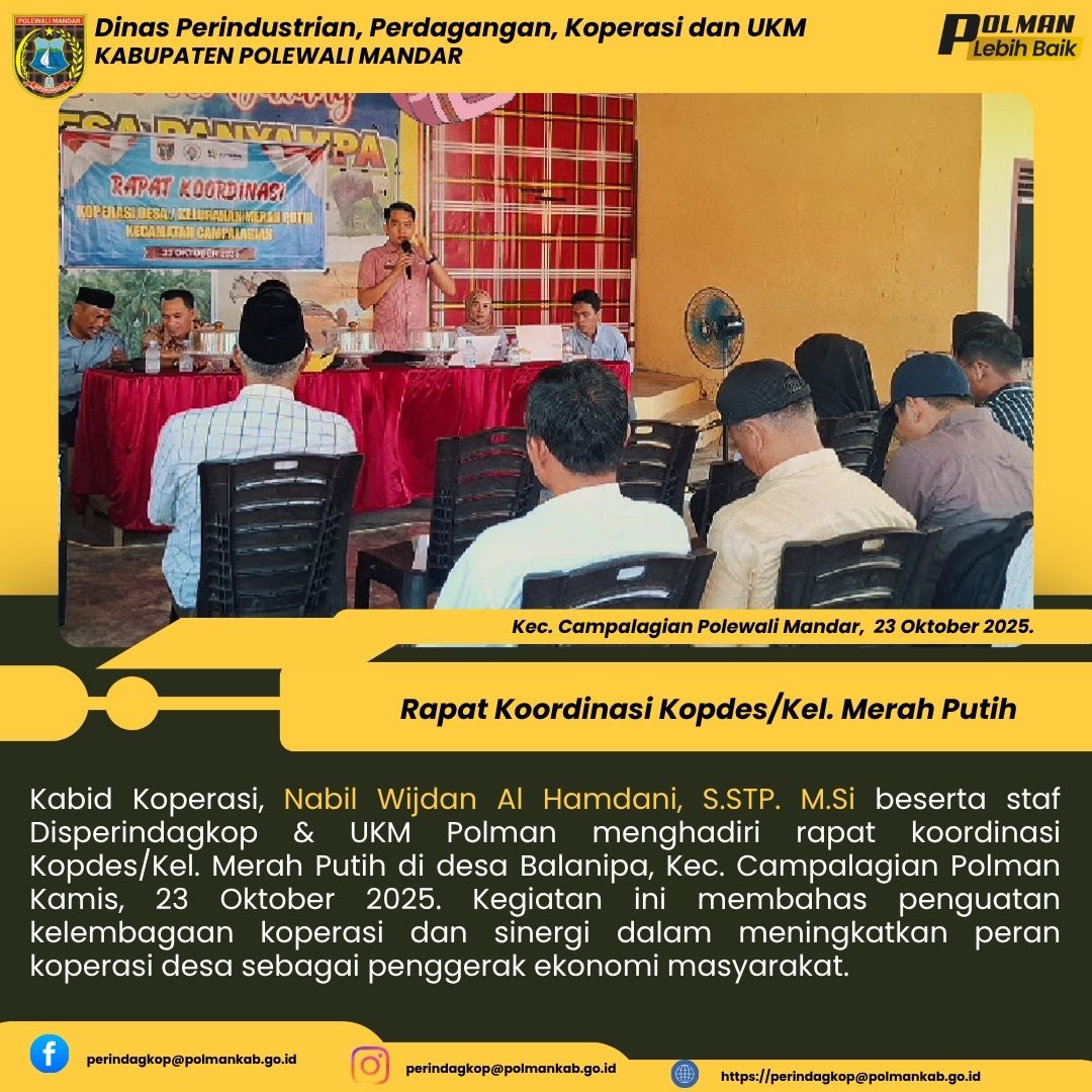 Kabid Koperasi, Nabil Wijdan Al Hamdani, S.STP. M.Si beserta staf Disperindagkop & UKM Polman menghadiri rapat koordinasi Kopdes/Kel. Merah Putih di desa Balanipa, Kec. Campalagian Polman Kamis, 23 Oktober 2025. Kegiatan ini membahas penguatan kelembagaan koperasi dan sinergi dalam meningkatkan peran koperasi desa sebagai penggerak ekonomi masyarakat....
