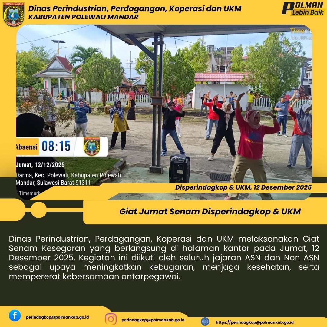 Dinas Perindustrian, Perdagangan, Koperasi dan UKM melaksanakan Giat Senam Kesegaran yang berlangsung di halaman kantor pada Jumat, 12 Desember 2025. Kegiatan ini diikuti oleh seluruh jajaran ASN dan Non ASN sebagai upaya meningkatkan kebugaran, menjaga kesehatan, serta mempererat kebersamaan antarpegawai....