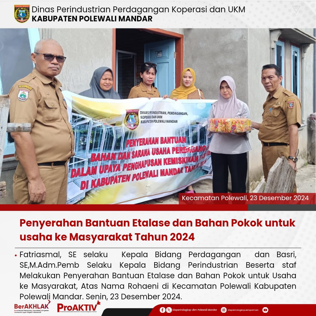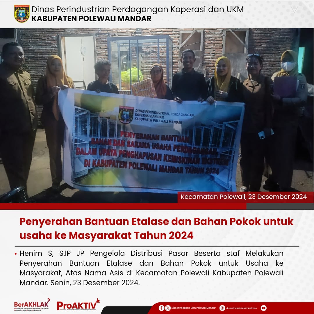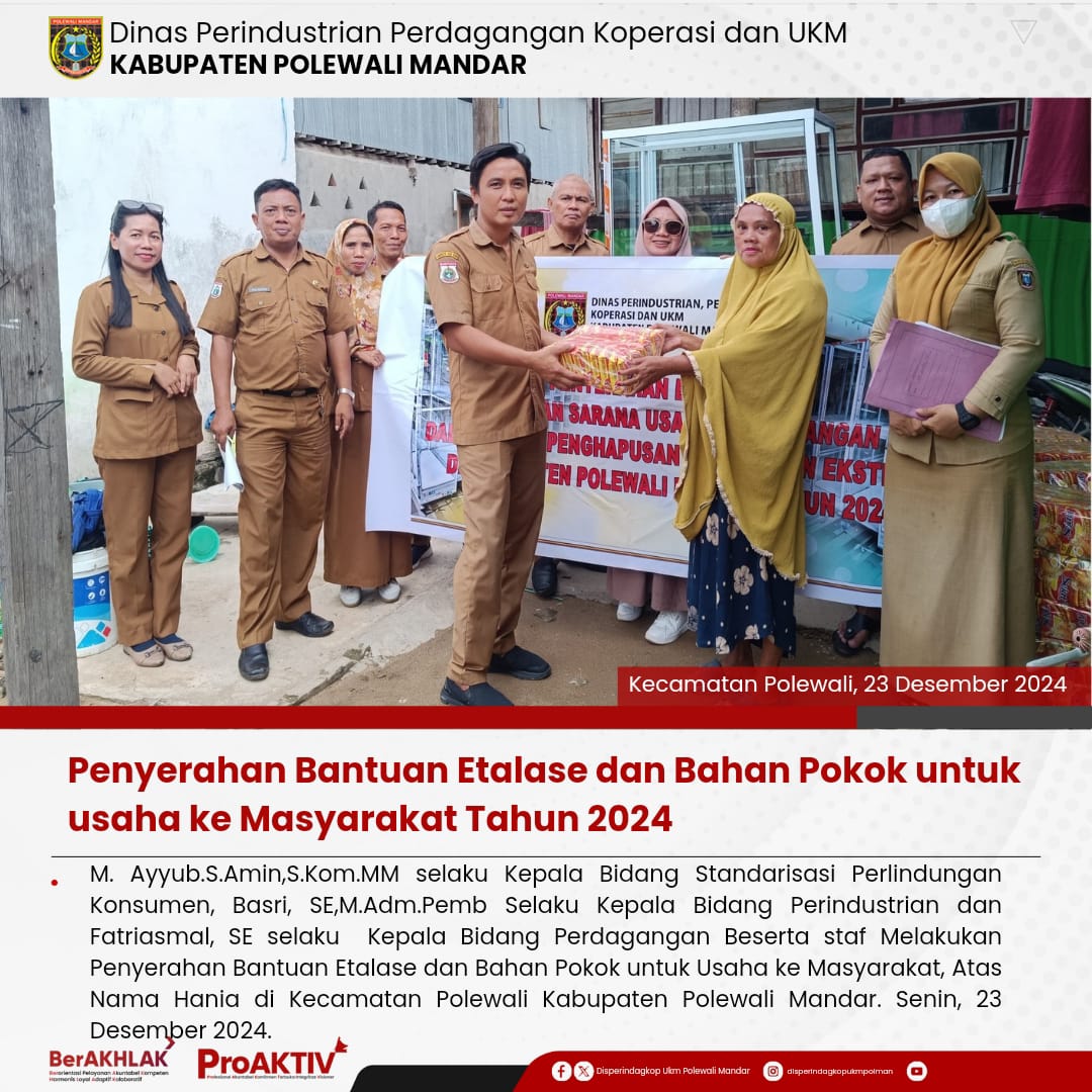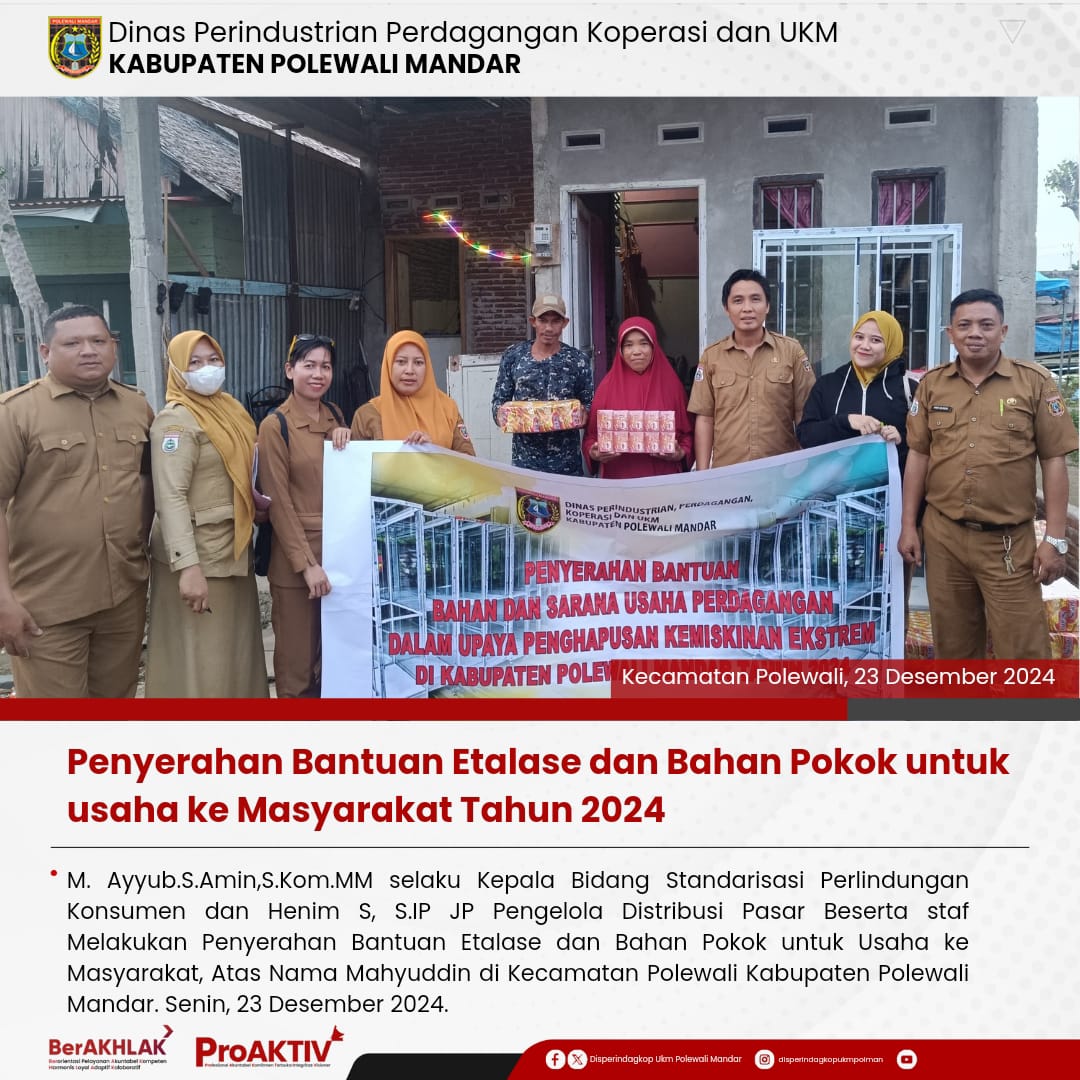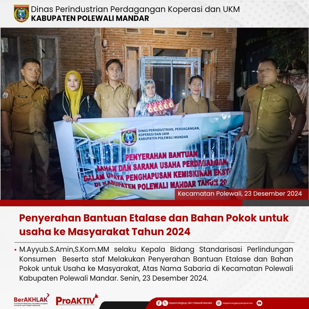 M.Ayyub.S.Amin, S.Kom., MM, selaku Kepala Bidang Standarisasi Perlindungan Konsumen bersama JP Pengelola Distribusi Pasar, Henim. S, S.IP beserta staf Dinas Perindagkop dan UKM melakukan penyerahan bantuan etalase dan bahan pokok untuk usaha bagi masyarakat, an. Mahyuddin, Muh. Ali dan Bunga Eja di Kecamatan Polewali, Kabupaten Polewali Mandar pada hari senin, 23 Desember 2024...