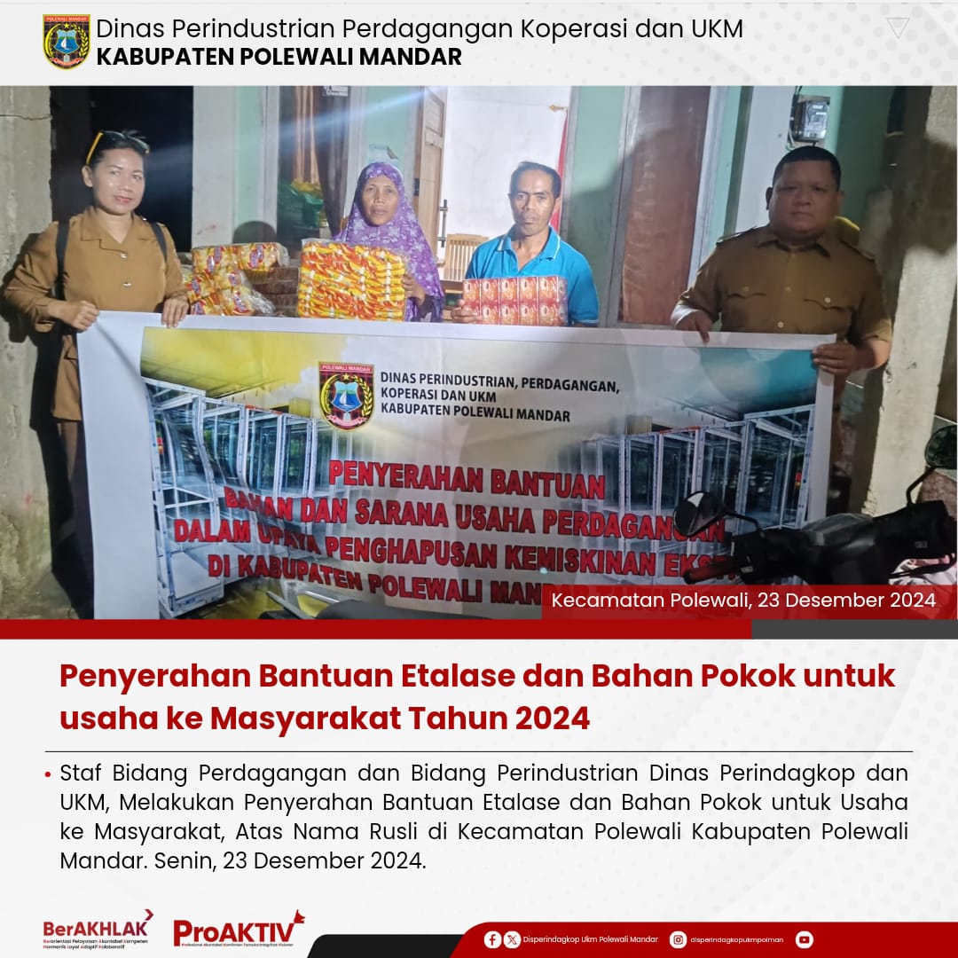 Pegawai Dinas Perindagkop dan UKM pada Bidang Perdagangan dan Perindustrian melakukan penyerahan bantuan etalase dan bahan pokok untuk usaha bagi masyarakat, an. Rusli di Kecamatan Polewali, Kabupaten Polewali Mandar pada hari senin, 23 Desember 2024...