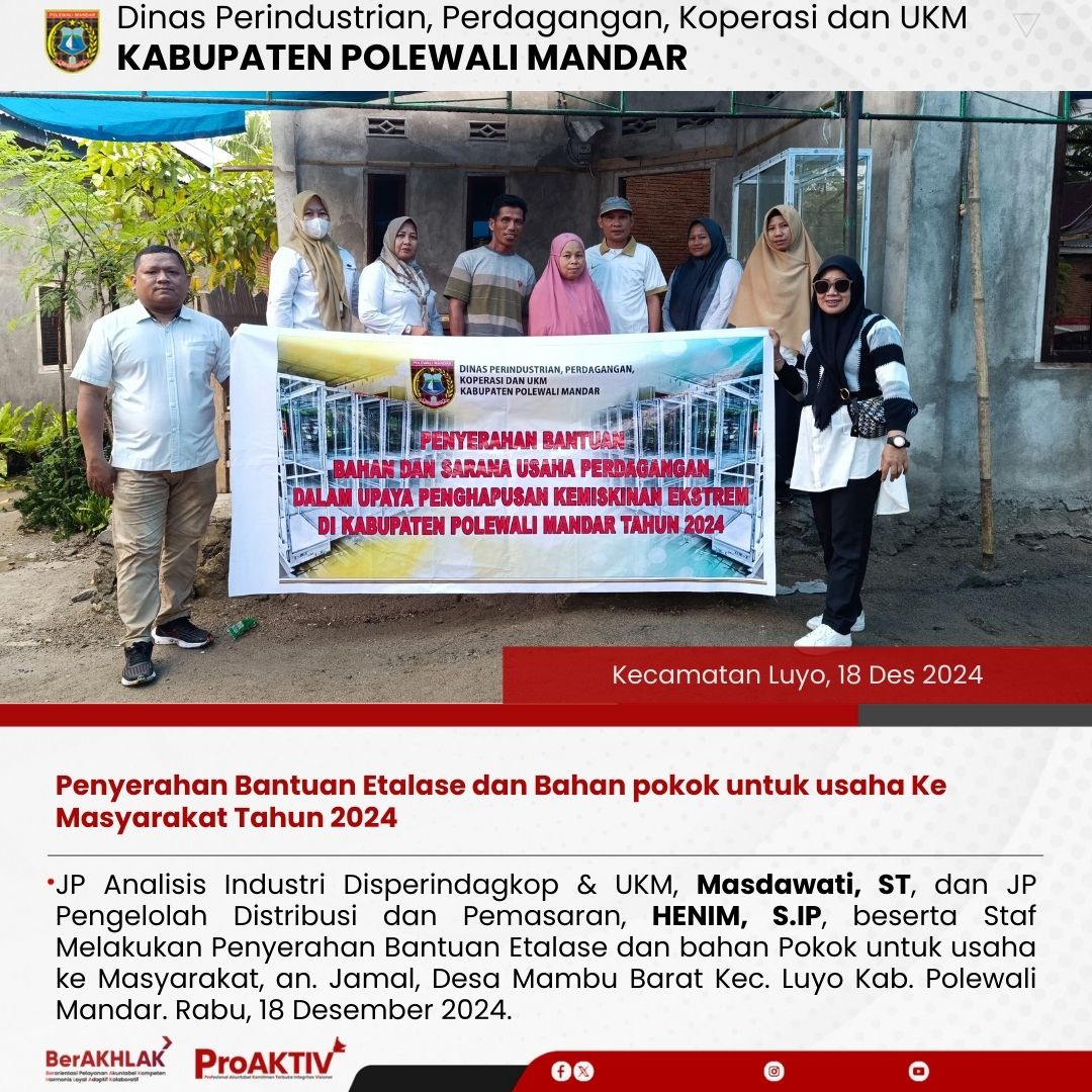 JP Analisis Industri Disperindagkop & UKM, Masdawati, ST, dan JP Pengelolah Distribusi dan Pemasaran, HENIM, S.IP, beserta Staf Melakukan Penyerahan Bantuan Etalase dan bahan Pokok untuk usaha ke Masyarakat, an. Jamal, Desa Mambu Barat Kec. Luyo Kab. Polewali Mandar. Rabu, 18 Desember 2024....