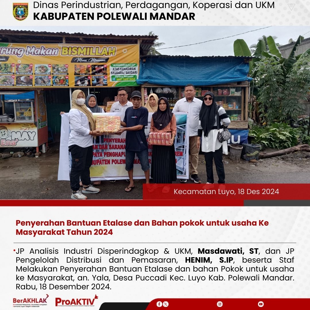 JP Analisis Industri Disperindagkop & UKM, Masdawati, ST, dan JP Pengelolah Distribusi dan Pemasaran, HENIM, S.IP, beserta Staf Melakukan Penyerahan Bantuan Etalase dan bahan Pokok untuk usaha ke Masyarakat, an. Yala, Desa Puccadi Kec. Luyo Kab. Polewali Mandar. Rabu, 18 Desember 2024....