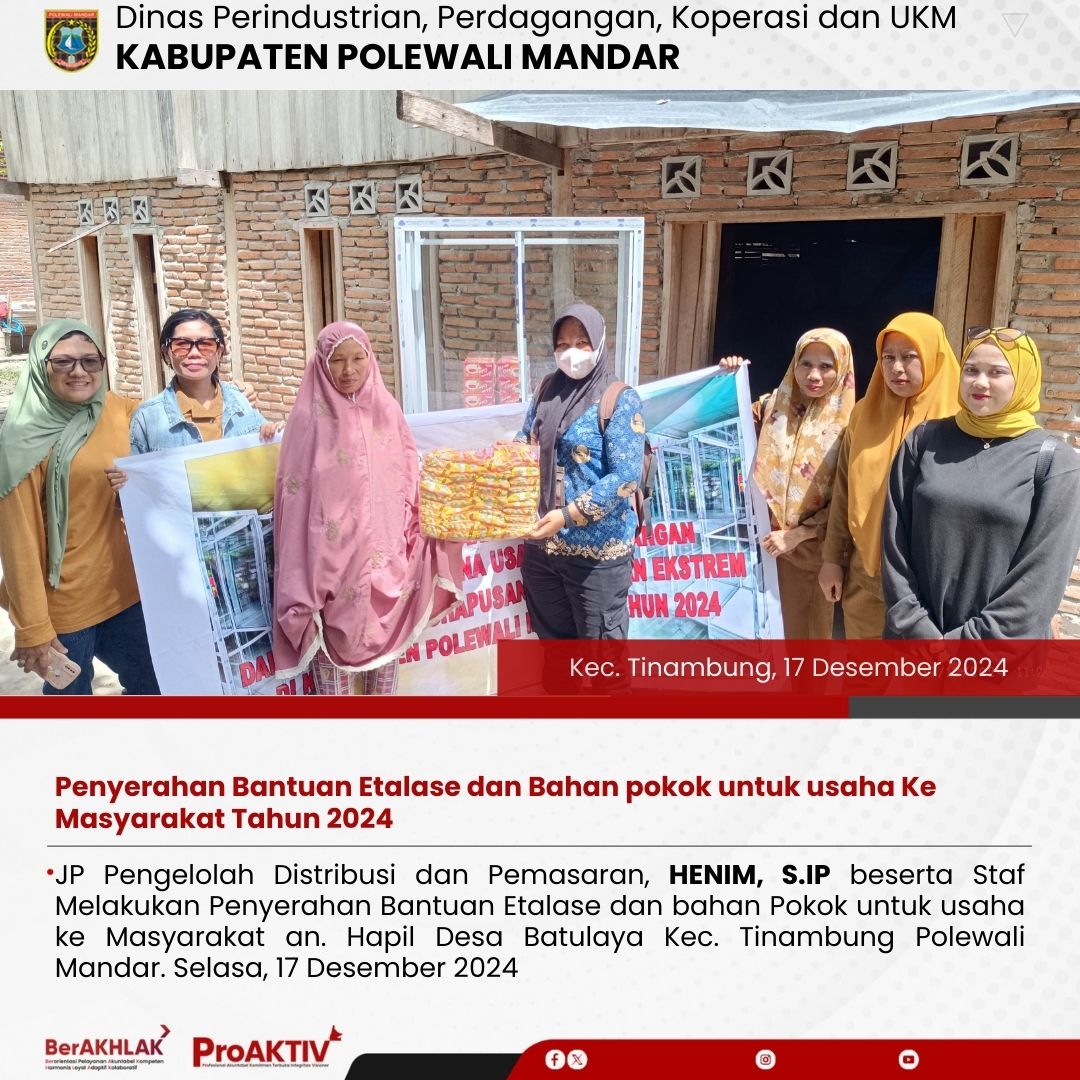 JP Pengelolah Distribusi dan Pemasaran, HENIM, S.IP dan JP Pengelola Sarana Perindustrian Makanan dan Minuman, Andi Mursid, beserta Staf Melakukan Penyerahan Bantuan Etalase dan bahan Pokok untuk usaha ke Masyarakat, an. Muslimin, Desa Karombang Kec. Bulo Kab. Polewali Mandar. Selasa, 17 Desember 2024...