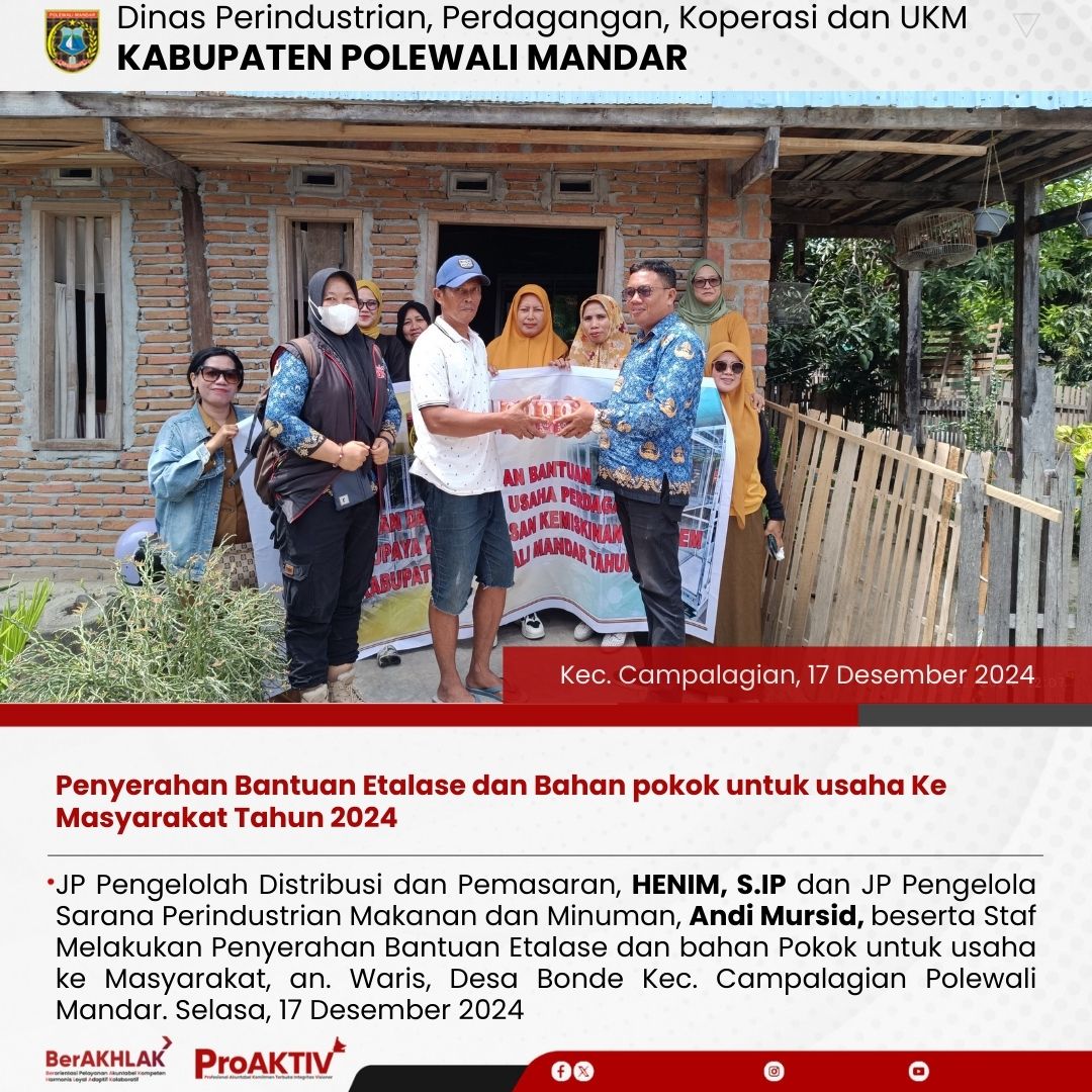 JP Pengelolah Distribusi dan Pemasaran, HENIM, S.IP dan JP Pengelola Sarana Perindustrian Makanan dan Minuman, Andi Mursid, beserta Staf Melakukan Penyerahan Bantuan Etalase dan bahan Pokok untuk usaha ke Masyarakat, an. Waris, Desa Bonde Kec. Campalagian Polewali Mandar. Selasa, 17 Desember 2024...