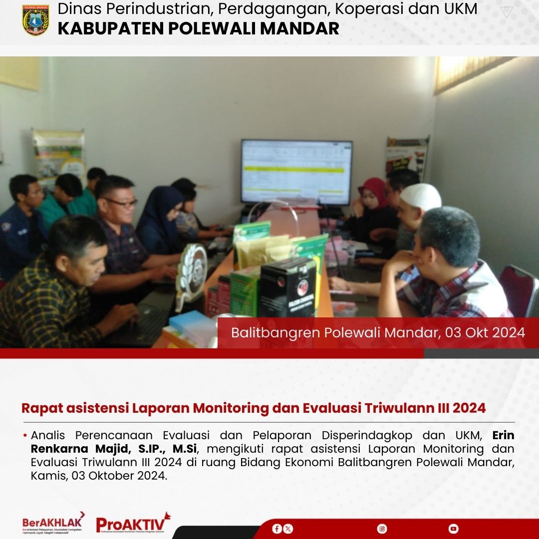 Analis Perencanaan Evaluasi dan Pelaporan Disperindagkop dan UKM, Erin Renkarna Majid, S.IP., M.Si, mengikuti rapat asistensi Laporan Monitoring dan Evaluasi Triwulann III 2024 di ruang Bidang Ekonomi Balitbangren Polewali Mandar, Kamis, 03 Oktober 2024....