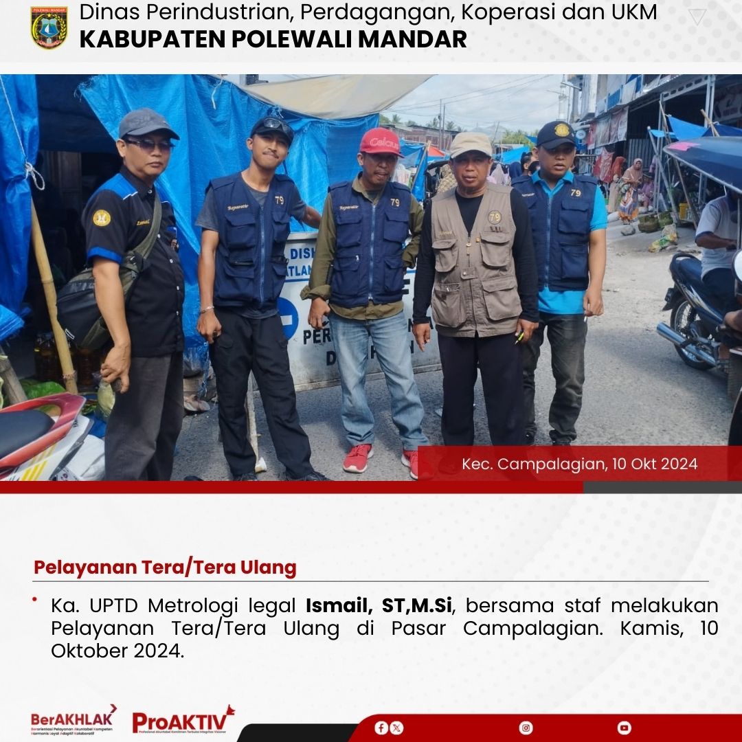 Ka. UPTD Metrologi legal Ismail, ST,M.Si, bersama staf melakukan Pelayanan Tera/Tera Ulang di Pasar Campalagian. Kamis, 10 Oktober 2024....