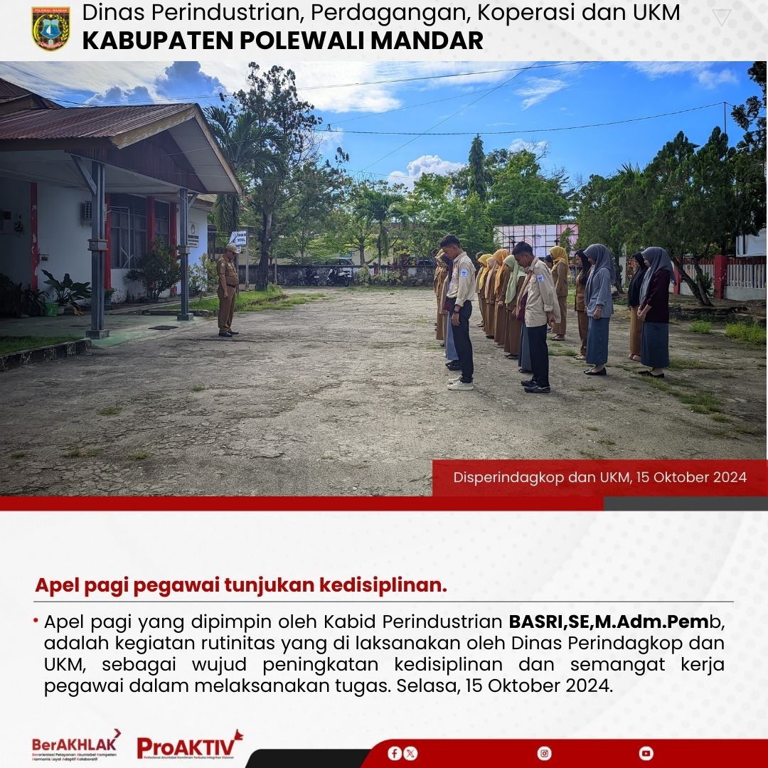 Apel pagi yang dipimpin oleh Kabid Perindustrian BASRI,SE,M.Adm.Pemb, adalah kegiatan rutinitas yang di laksanakan oleh Dinas Perindagkop dan UKM, sebagai wujud peningkatan kedisiplinan dan semangat kerja pegawai dalam melaksanakan tugas. Selasa, 15 Oktober 2024....