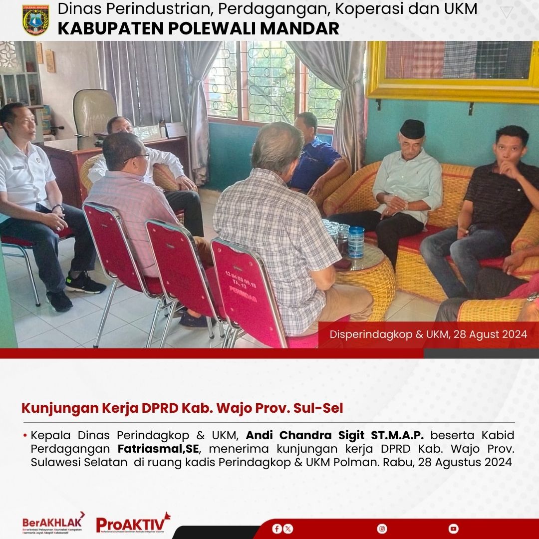 Kepala Dinas Perindagkop & UKM, Andi Chandra Sigit ST.M.A.P. beserta Kabid Perdagangan Fatriasmal,SE, menerima kunjungan kerja DPRD Kab. Wajo Prov. Sulawesi Selatan di ruang kadis Perindagkop & UKM Polman. Rabu, 28 Agustus 2024...
