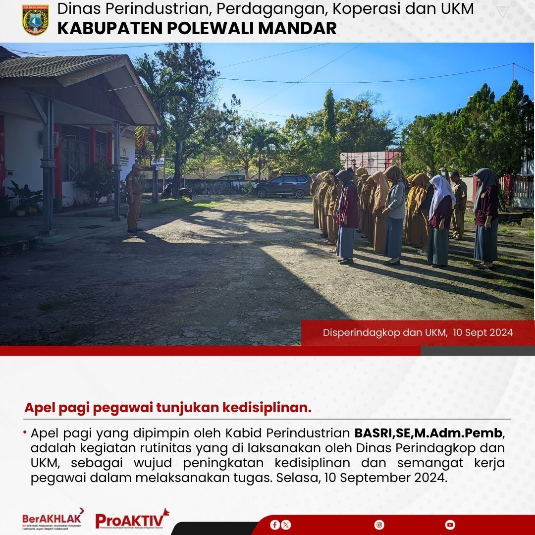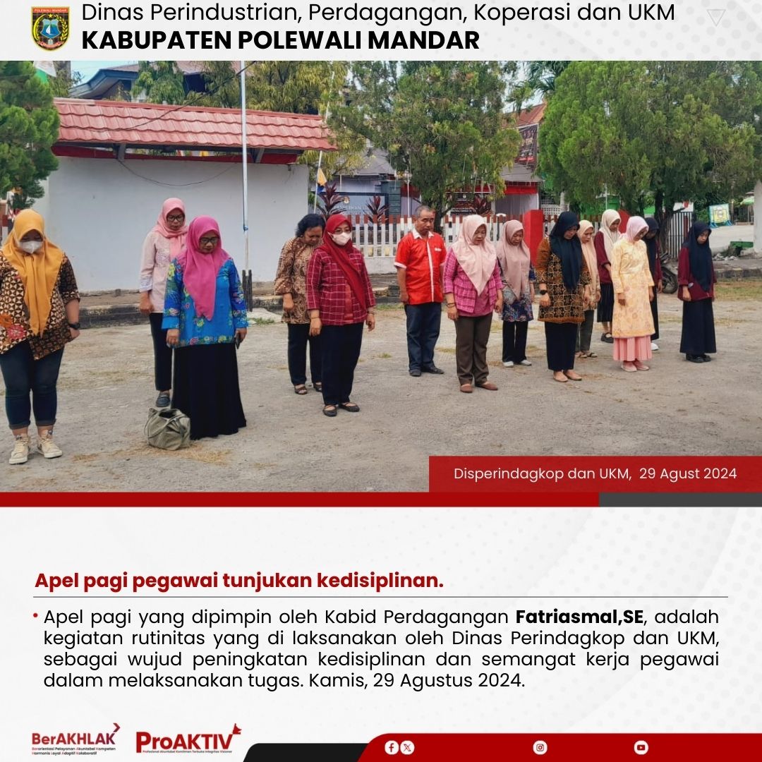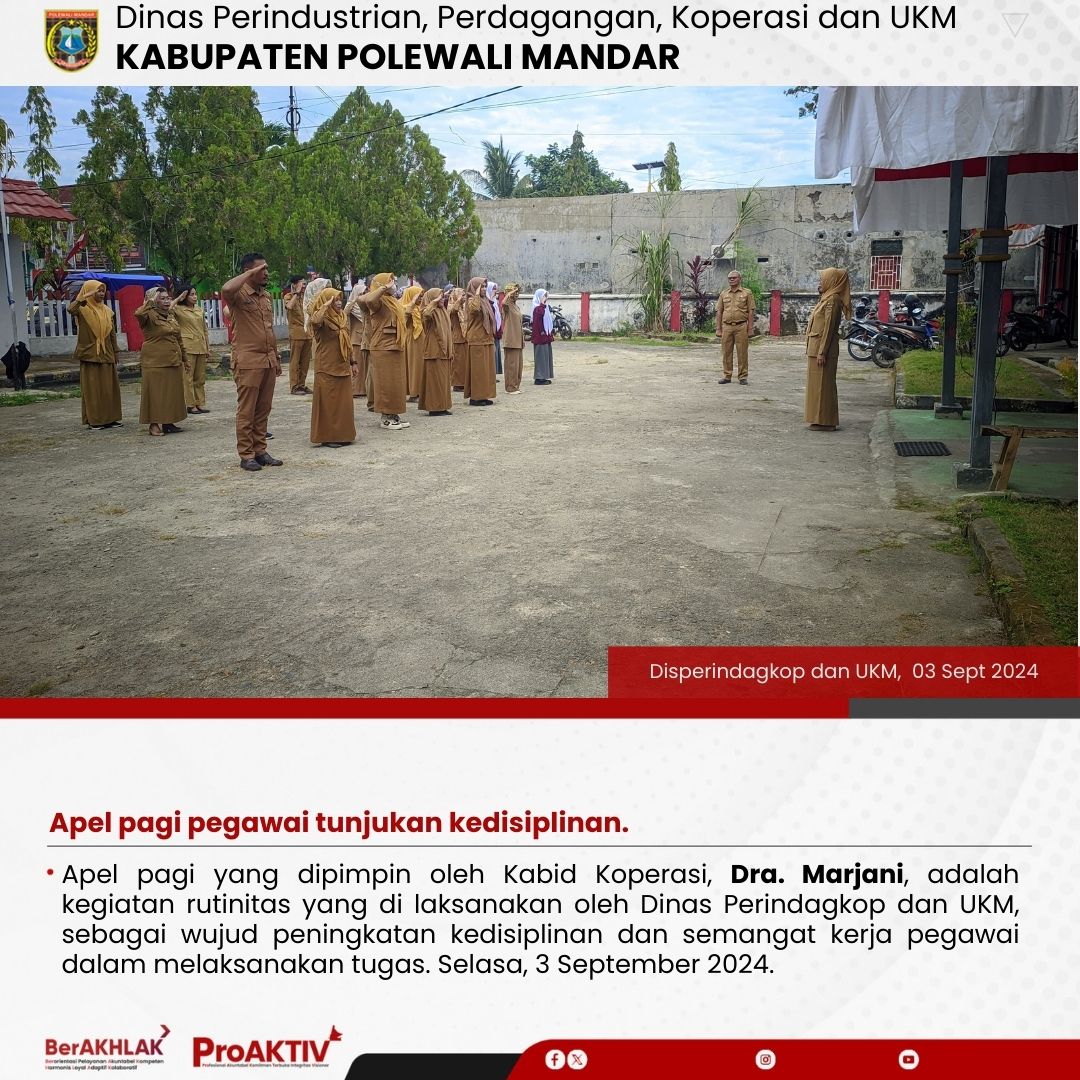 Apel pagi yang dipimpin oleh Kabid Koperasi, Dra. Marjani, adalah kegiatan rutinitas yang di laksanakan oleh Dinas Perindagkop dan UKM, sebagai wujud peningkatan kedisiplinan dan semangat kerja pegawai dalam melaksanakan tugas. Selasa, 3 September 2024....