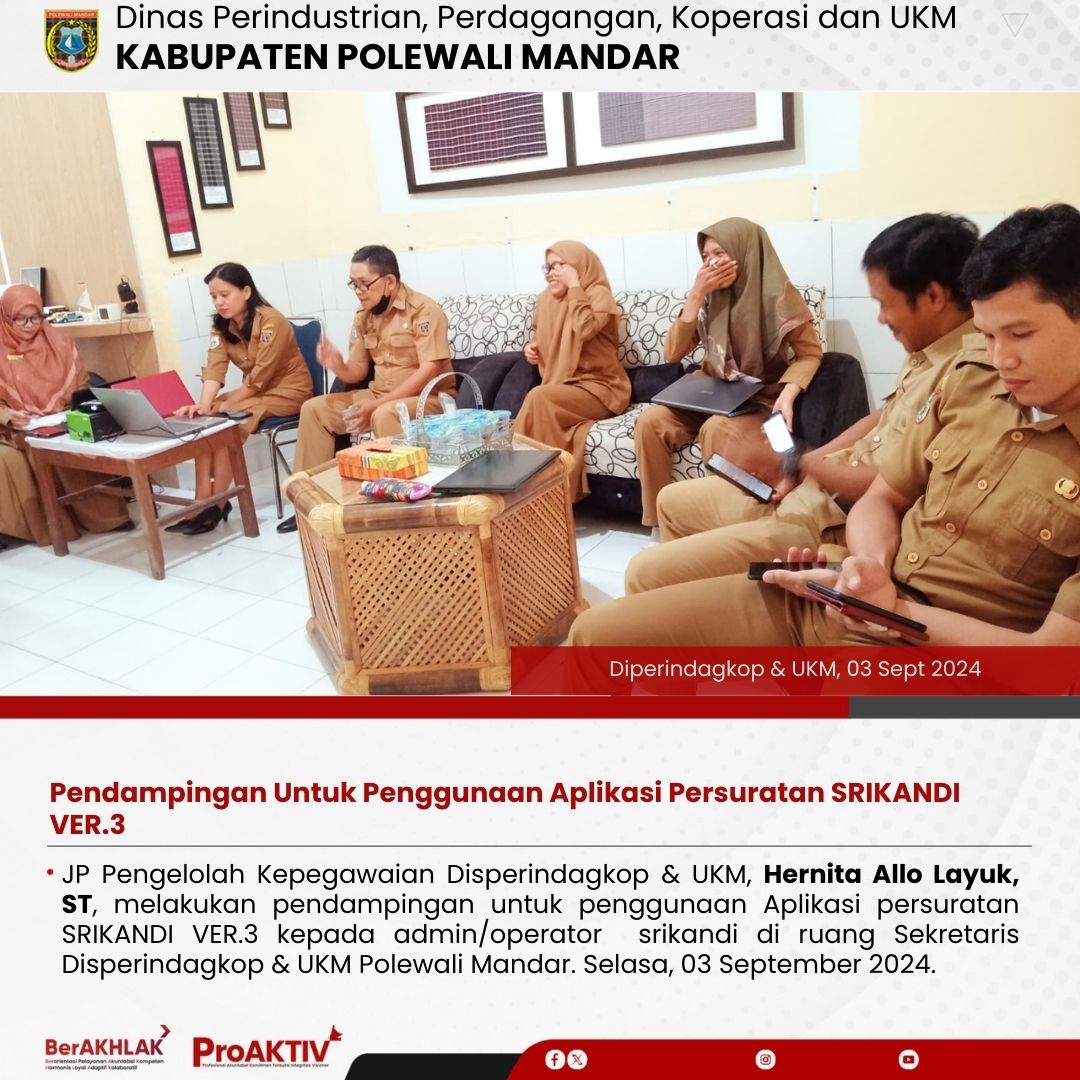 JP Pengelolah Kepegawaian Disperindagkop & UKM, Hernita Allo Layuk, ST, melakukan pendampingan untuk penggunaan Aplikasi persuratan SRIKANDI VER.3 kepada admin/operator srikandi di ruang Sekretaris Disperindagkop & UKM Polewali Mandar. Selasa, 03 September 2024....