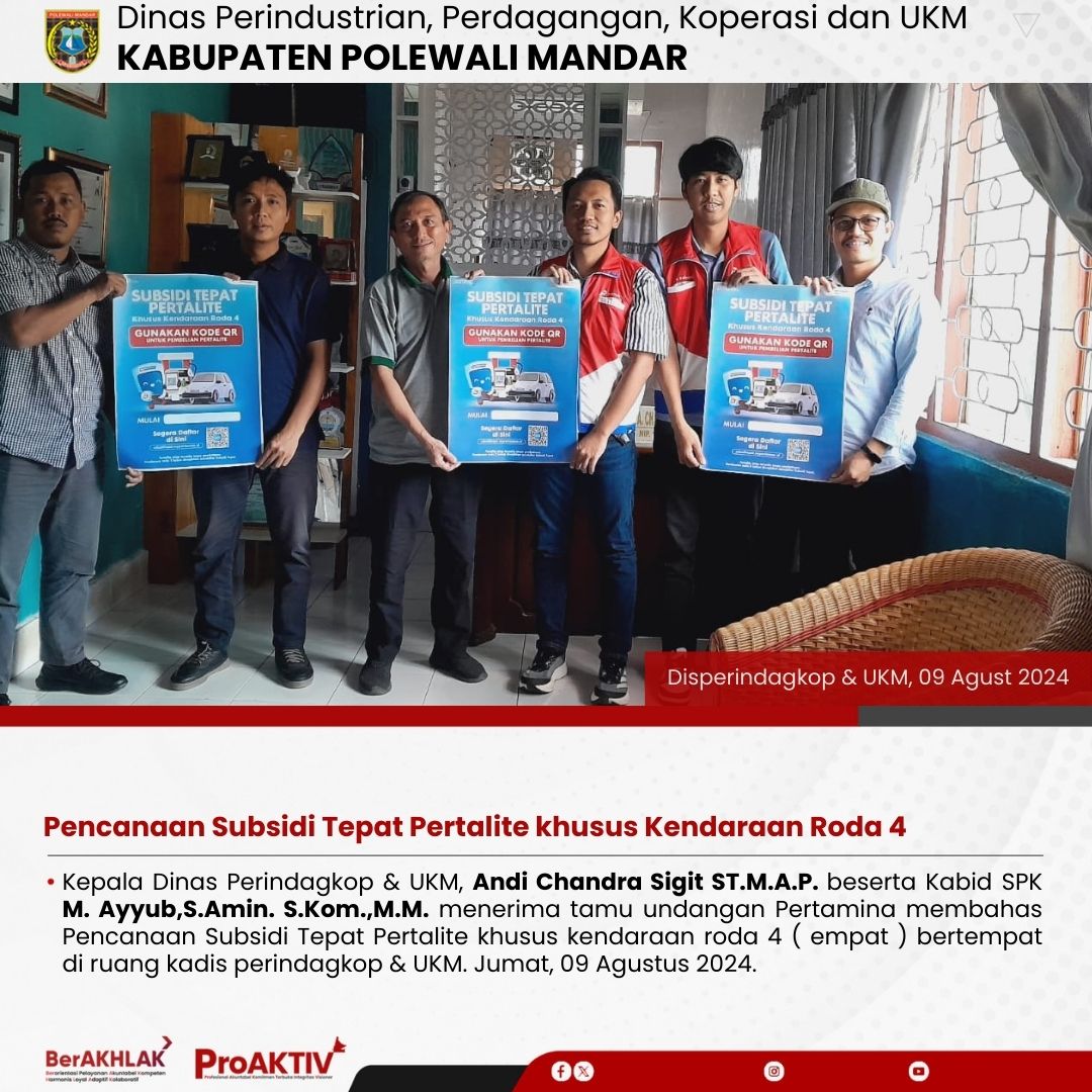 Kepala Dinas Perindagkop & UKM, Andi Chandra Sigit ST.M.A.P. beserta Kabid SPK M. Ayyub,S.Amin. S.Kom.,M.M. menerima tamu undangan Pertamina membahas Pencanaan Subsidi Tepat Pertalite khusus kendaraan roda 4 ( empat ) bertempat di ruang kadis perindagkop & UKM. Jumat, 09 Agustus 2024....
