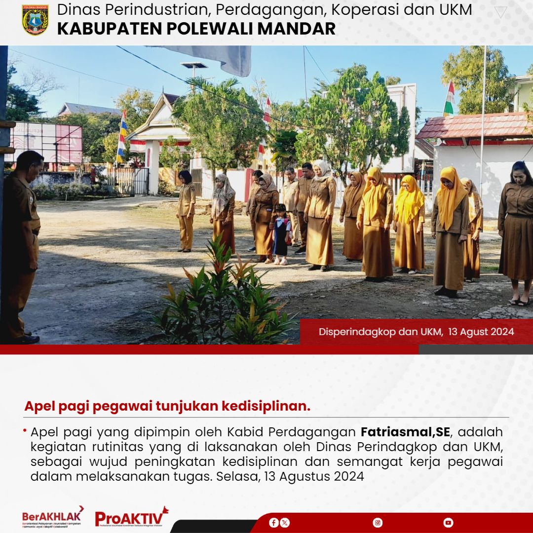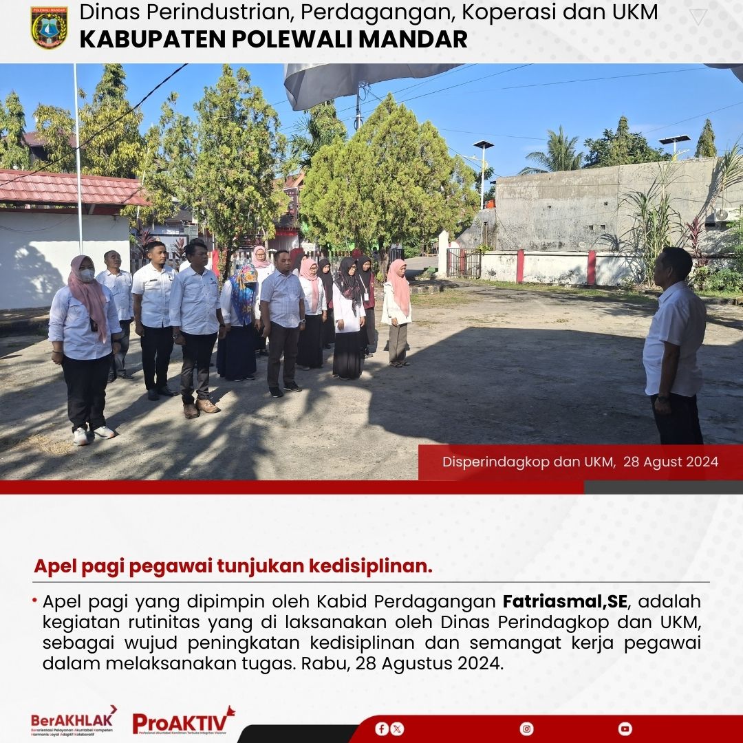 Apel pagi yang dipimpin oleh Kepala Dinas Perindagkop & UKM, Andi Chandra Sigit, ST.M.A.P, adalah kegiatan rutinitas yang di laksanakan oleh Dinas Perindagkop dan UKM, sebagai wujud peningkatan kedisiplinan dan semangat kerja pegawai dalam melaksanakan tugas. Selasa, 27 Agustus 2024....