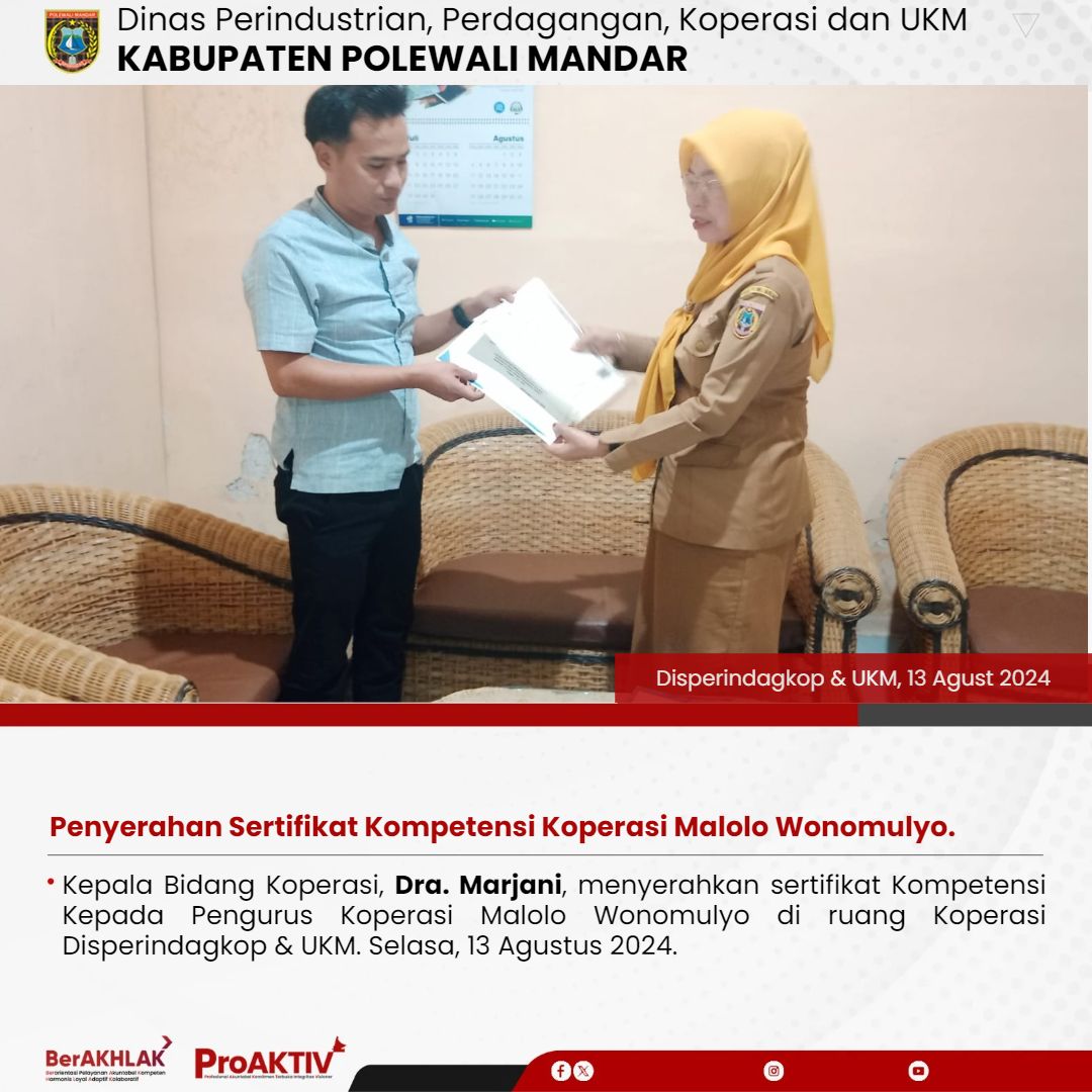 Penyerahan Sertifikat Kompetensi Koperasi Malolo Wonomulyo. Selasa, 13 Agustus 2024...