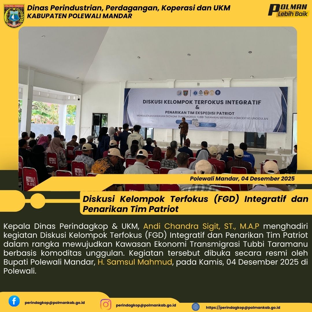 Kepala Dinas Perindagkop & UKM, Andi Chandra Sigit, ST., M.A.P menghadiri kegiatan Diskusi Kelompok Terfokus (FGD) Integratif dan Penarikan Tim Patriot dalam rangka mewujudkan Kawasan Ekonomi Transmigrasi Tubbi Taramanu berbasis komoditas unggulan. Kegiatan tersebut dibuka secara resmi oleh Bupati Polewali Mandar, H. Samsul Mahmud, pada Kamis, 04 Desember 2025 di Polewali....