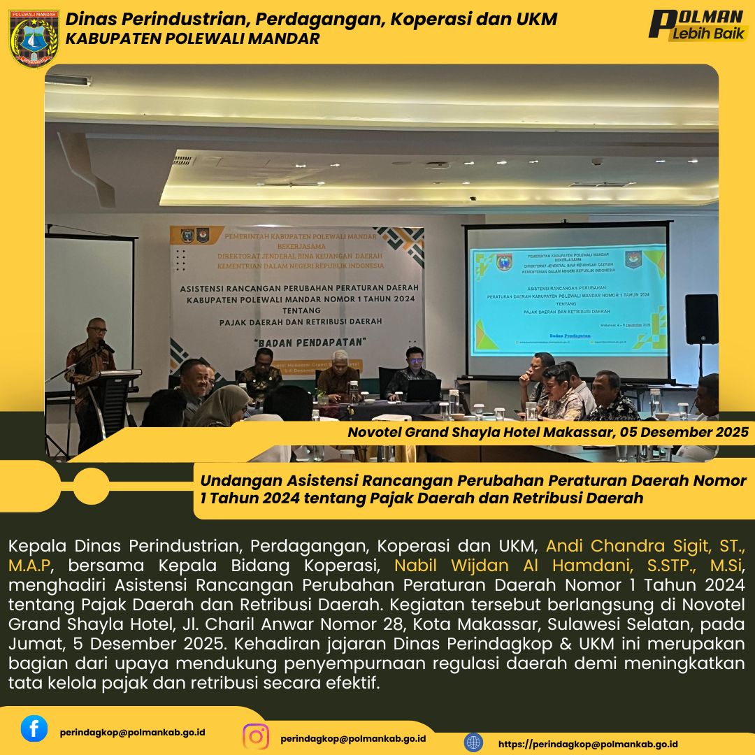 Kepala Dinas Perindustrian, Perdagangan, Koperasi dan UKM, Andi Chandra Sigit, ST., M.A.P, bersama Kepala Bidang Koperasi, Nabil Wijdan Al Hamdani, S.STP., M.Si, menghadiri Asistensi Rancangan Perubahan Peraturan Daerah Nomor 1 Tahun 2024 tentang Pajak Daerah dan Retribusi Daerah. Kegiatan tersebut berlangsung di Novotel Grand Shayla Hotel, Jl. Charil Anwar Nomor 28, Kota Makassar, Sulawesi Selatan, pada Jumat, 5 Desember 2025. Kehadiran jajaran Dinas Perindagkop & UKM ini merupakan bagian d...