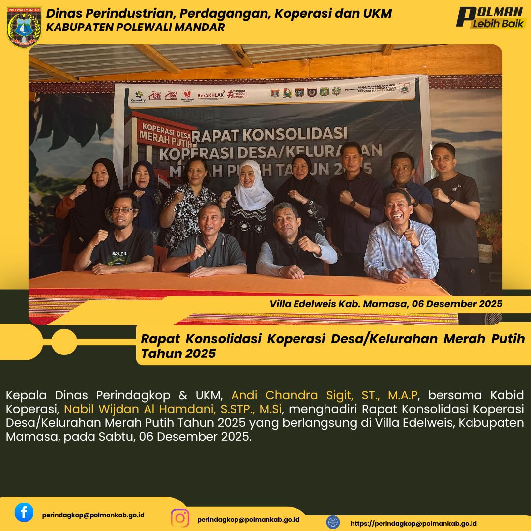 Kepala Dinas Perindagkop & UKM, Andi Chandra Sigit, ST., M.A.P, bersama Kabid Koperasi, Nabil Wijdan Al Hamdani, S.STP., M.Si, menghadiri Rapat Konsolidasi Koperasi Desa/Kelurahan Merah Putih Tahun 2025 yang berlangsung di Villa Edelweis, Kabupaten Mamasa, pada Sabtu, 06 Desember 2025....