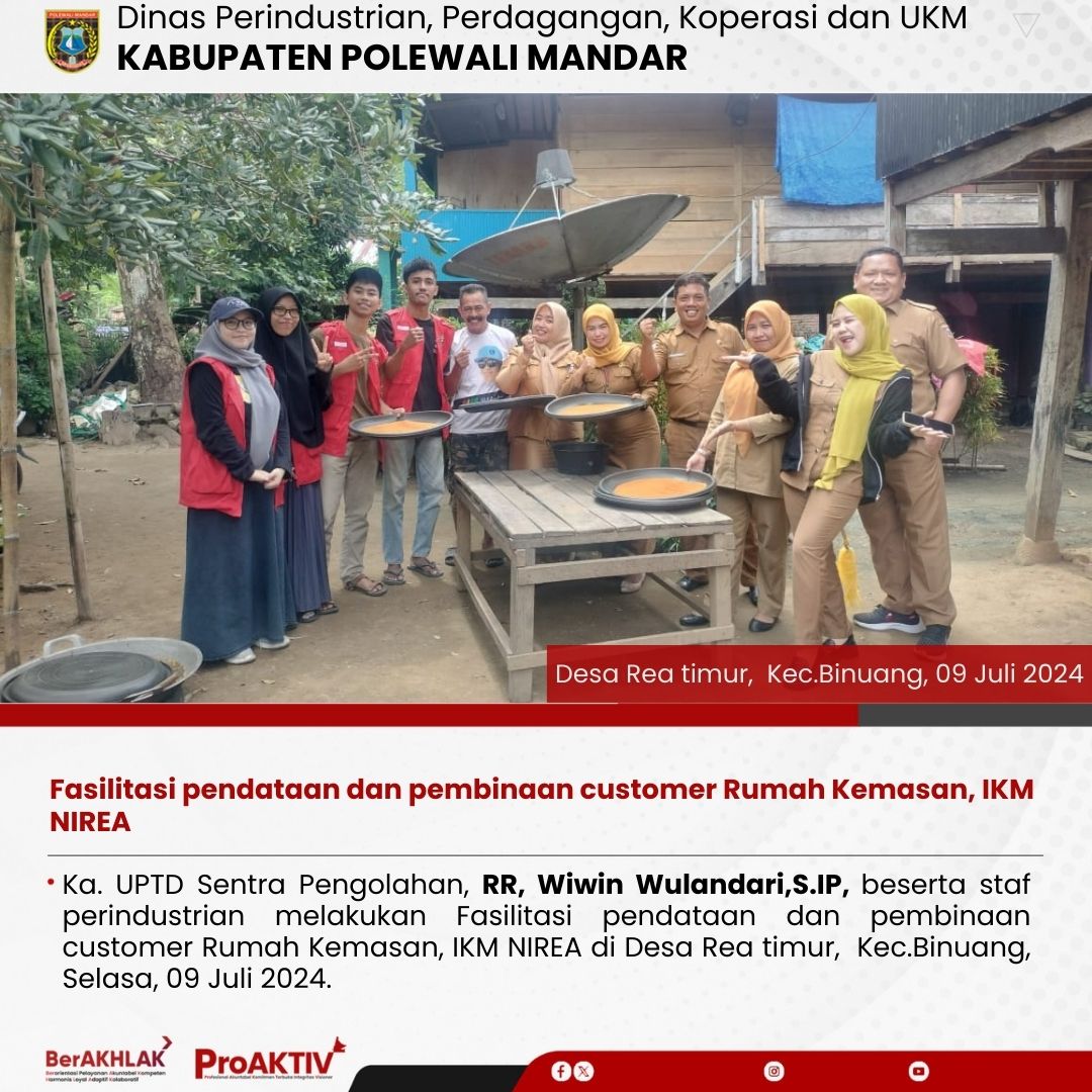 Ka. UPTD Sentra Pengolahan, RR, Wiwin Wulandari,S.IP, beserta staf perindustrian melakukan Fasilitasi pendataan dan pembinaan customer Rumah Kemasan, IKM NIREA di Desa Rea timur, Kec.Binuang, Selasa, 09 Juli 2024....