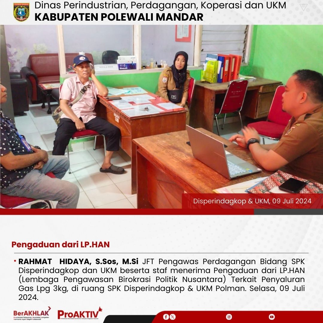 RAHMAT HIDAYA, S.Sos, M.Si JFT Pengawas Perdagangan Bidang SPK Disperindagkop dan UKM beserta staf menerima Pengaduan dari LP.HAN (Lembaga Pengawasan Birokrasi Politik Nusantara) Terkait Penyaluran Gas Lpg 3kg, di ruang SPK Disperindagkop & UKM Polman. Selasa, 09 Juli 2024....