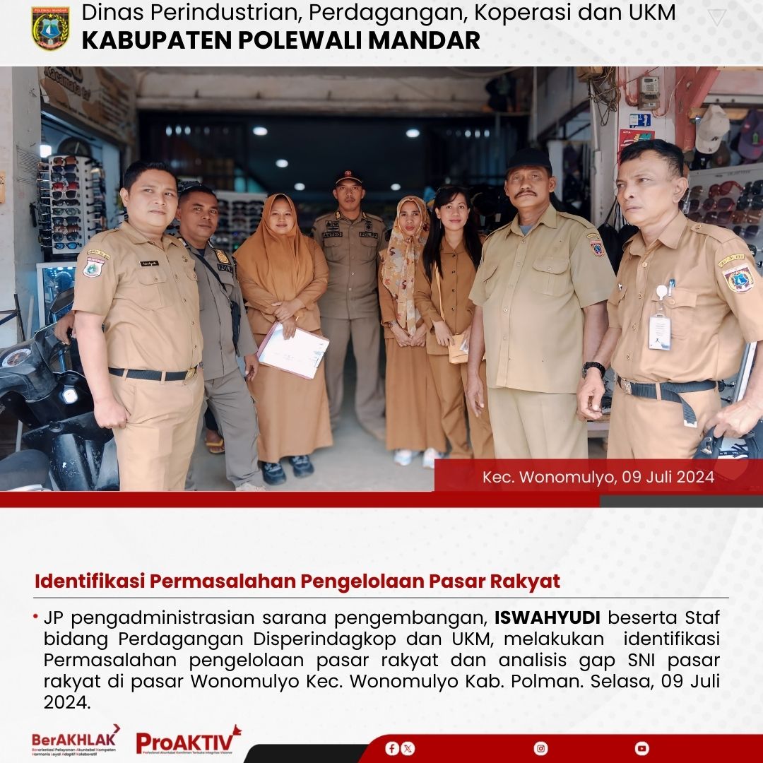 JP pengadministrasian sarana pengembangan, ISWAHYUDI beserta Staf bidang Perdagangan Disperindagkop dan UKM, melakukan identifikasi Permasalahan pengelolaan pasar rakyat dan analisis gap SNI pasar rakyat di pasar Wonomulyo Kec. Wonomulyo Kab. Polman. Selasa, 09 Juli 2024....