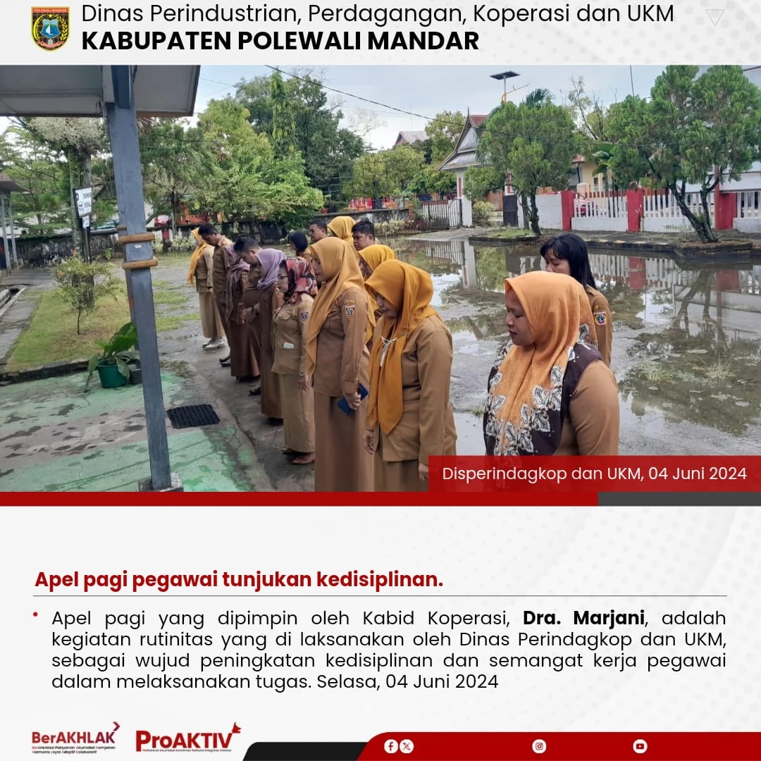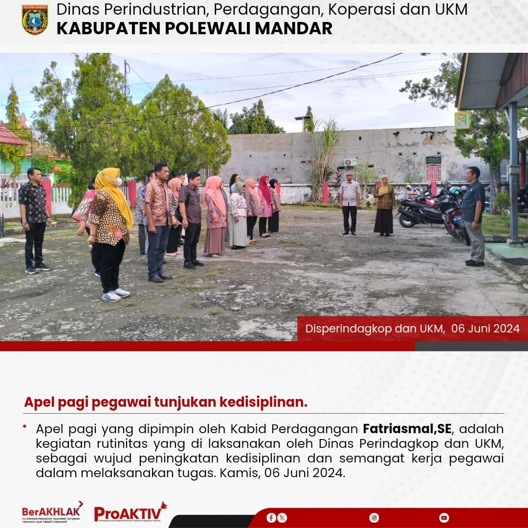 Apel pagi yang dipimpin oleh Kabid Perdagangan Fatriasmal,SE, adalah kegiatan rutinitas yang di laksanakan oleh Dinas Perindagkop dan UKM, sebagai wujud peningkatan kedisiplinan dan semangat kerja pegawai dalam melaksanakan tugas. Kamis, 06 Juni 2024....