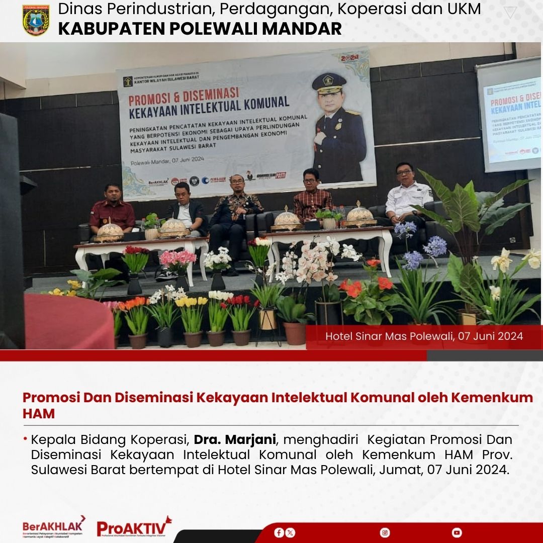 Kepala Bidang Koperasi, Dra. Marjani, menghadiri Kegiatan Promosi Dan Diseminasi Kekayaan Intelektual Komunal oleh Kemenkum HAM Prov. Sulawesi Barat bertempat di Hotel Sinar Mas Polewali, Jumat, 07 Juni 2024....