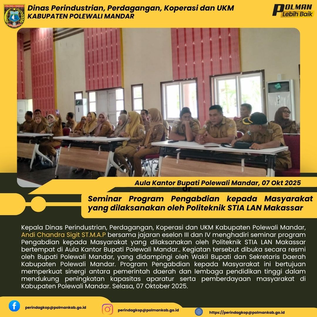 Kepala Dinas Perindustrian, Perdagangan, Koperasi dan UKM Kabupaten Polewali Mandar, Andi Chandra Sigit ST.M.A.P bersama jajaran eselon III dan IV menghadiri seminar program Pengabdian kepada Masyarakat yang dilaksanakan oleh Politeknik STIA LAN Makassar bertempat di Aula Kantor Bupati Polewali Mandar.. Kegiatan tersebut dibuka secara resmi oleh Bupati Polewali Mandar, yang didampingi oleh Wakil Bupati dan Sekretaris Daerah Kabupaten Polewali Mandar. Program Pengabdian kepada Masyarakat ini bert...