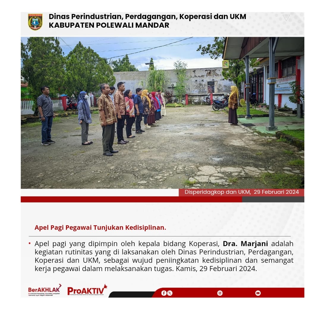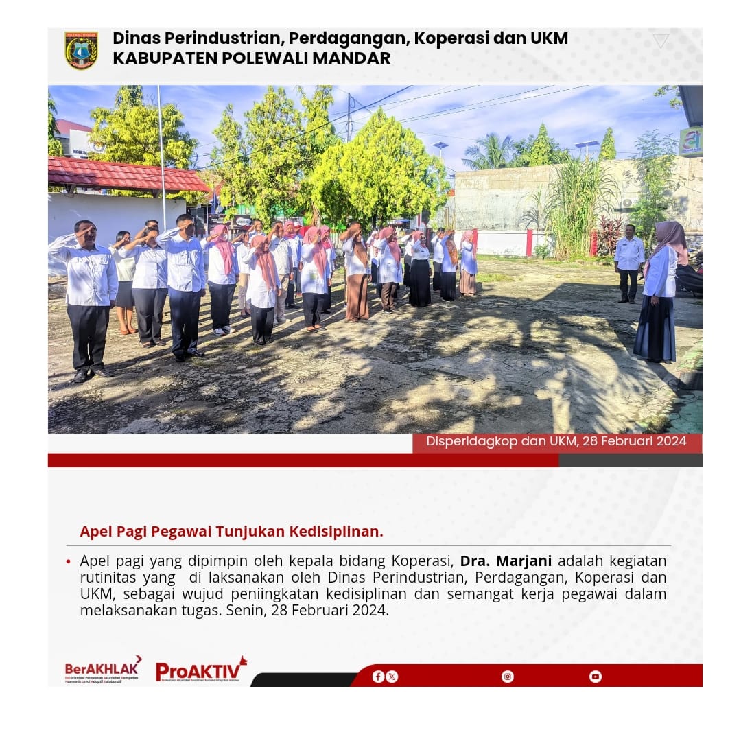 Apel Pagi Disperindagkop dan UKM dipimpin oleh Kepala Bidang Koperasi dan UKM, Dra. Marjani...