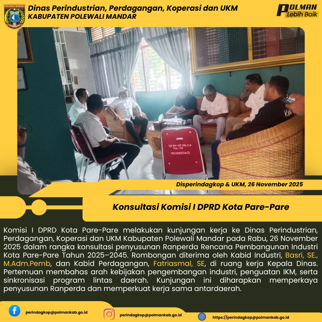 Komisi I DPRD Kota Pare-Pare melakukan kunjungan kerja ke Dinas Perindustrian, Perdagangan, Koperasi dan UKM Kabupaten Polewali Mandar pada Rabu, 26 November 2025 dalam rangka konsultasi penyusunan Ranperda Rencana Pembangunan Industri Kota Pare-Pare Tahun 2025–2045. Rombongan diterima oleh Kabid Industri, Basri, SE., M.Adm.Pemb, dan Kabid Perdagangan, Fatriasmal, SE, di ruang kerja Kepala Dinas. Pertemuan membahas arah kebijakan pengembangan industri, penguatan IKM, serta sinkronisasi program...