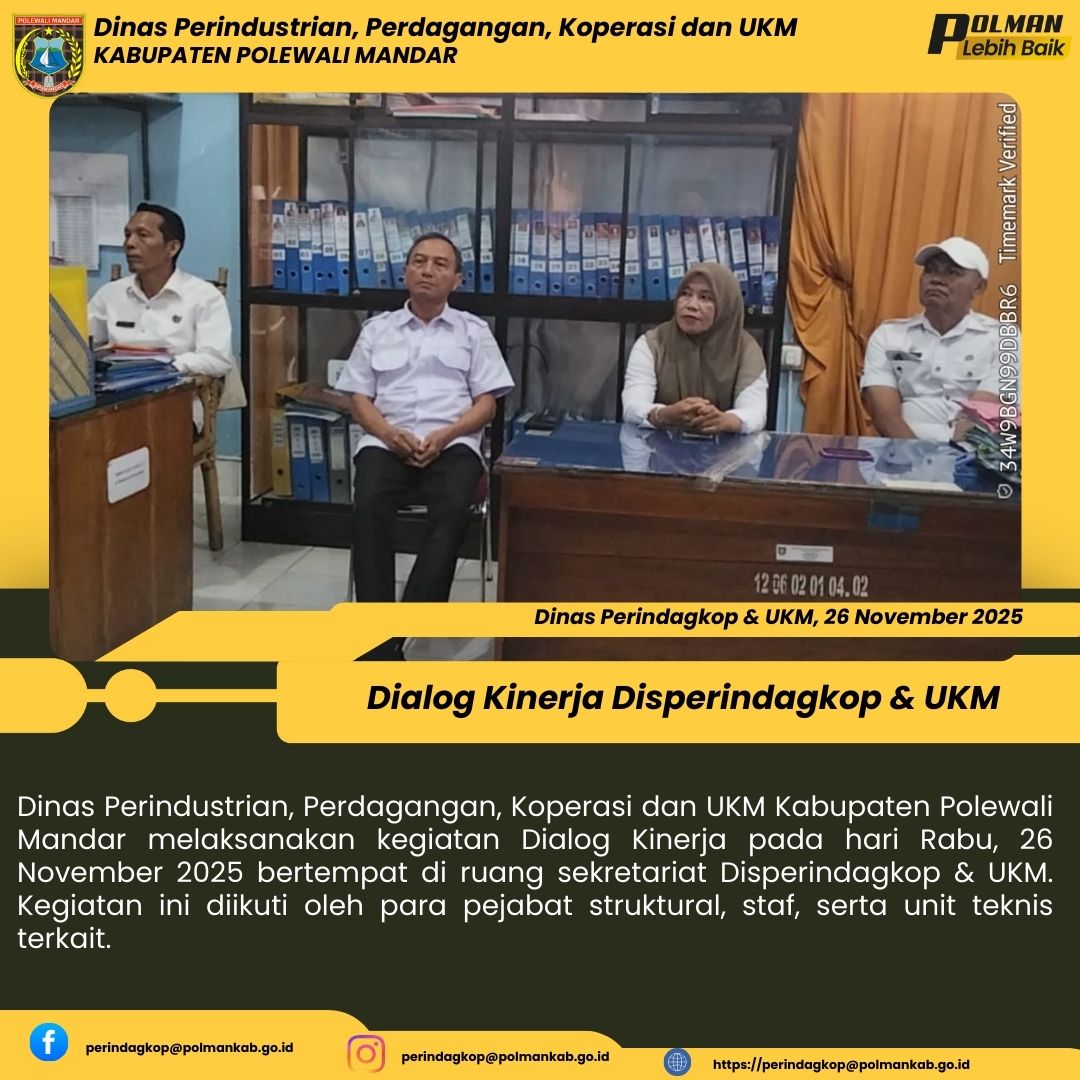 Dinas Perindustrian, Perdagangan, Koperasi dan UKM Kabupaten Polewali Mandar melaksanakan kegiatan Dialog Kinerja pada hari Rabu, 26 November 2025 bertempat di ruang sekretariat Disperindagkop & UKM. Kegiatan ini diikuti oleh para pejabat struktural, staf, serta unit teknis terkait....