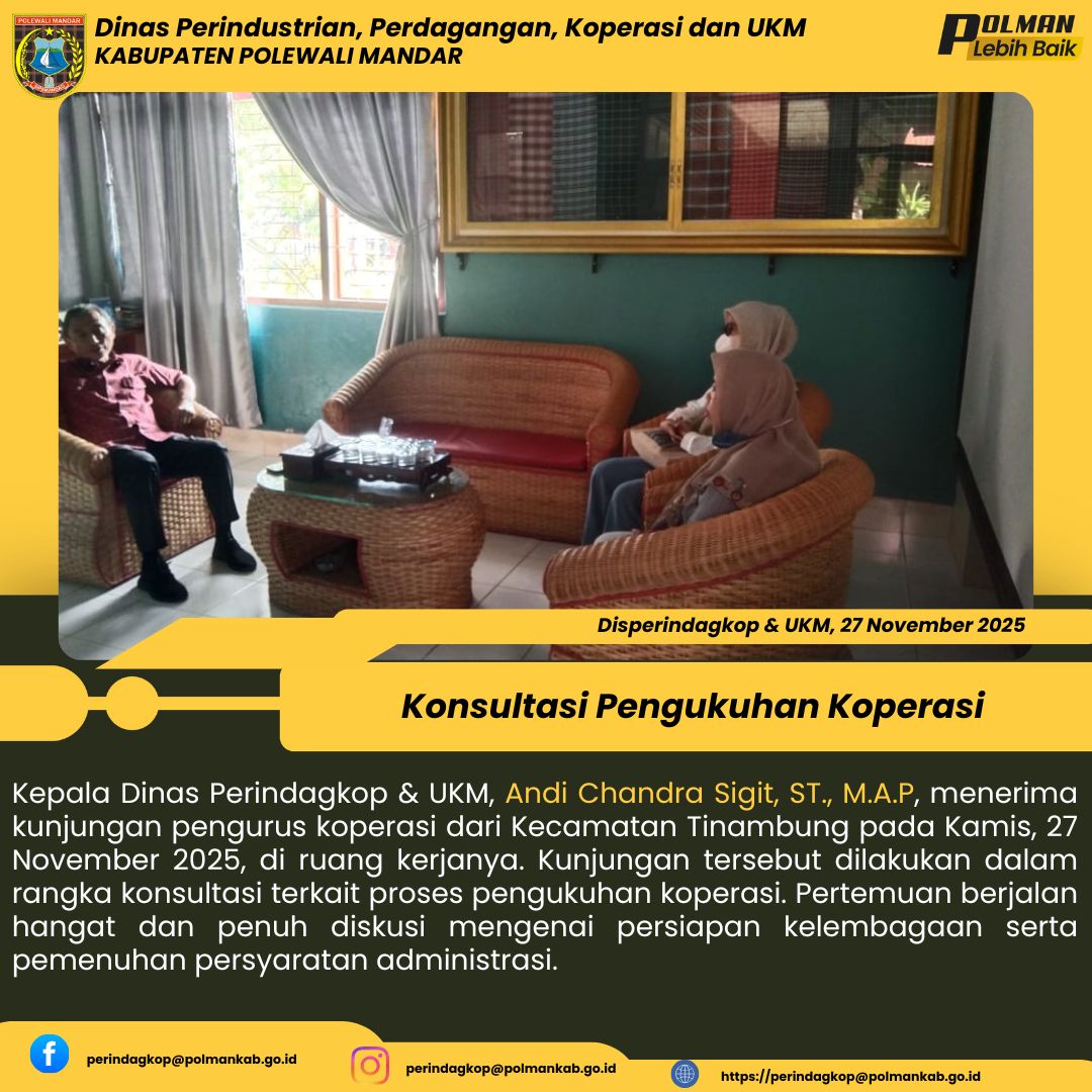 Kepala Dinas Perindagkop & UKM, Andi Chandra Sigit, ST., M.A.P, menerima kunjungan pengurus koperasi dari Kecamatan Tinambung pada Kamis, 27 November 2025, di ruang kerjanya. Kunjungan tersebut dilakukan dalam rangka konsultasi terkait proses pengukuhan koperasi. Pertemuan berjalan hangat dan penuh diskusi mengenai persiapan kelembagaan serta pemenuhan persyaratan administrasi....
