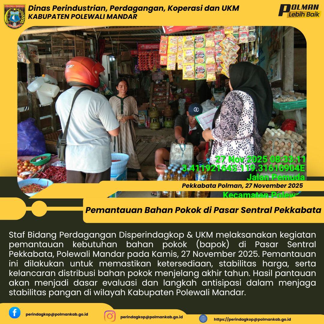 Staf Bidang Perdagangan Disperindagkop & UKM melaksanakan kegiatan pemantauan kebutuhan bahan pokok (bapok) di Pasar Sentral Pekkabata, Polewali Mandar pada Kamis, 27 November 2025. Pemantauan ini dilakukan untuk memastikan ketersediaan, stabilitas harga, serta kelancaran distribusi bahan pokok menjelang akhir tahun. Hasil pantauan akan menjadi dasar evaluasi dan langkah antisipasi dalam menjaga stabilitas pangan di wilayah Kabupaten Polewali Mandar....