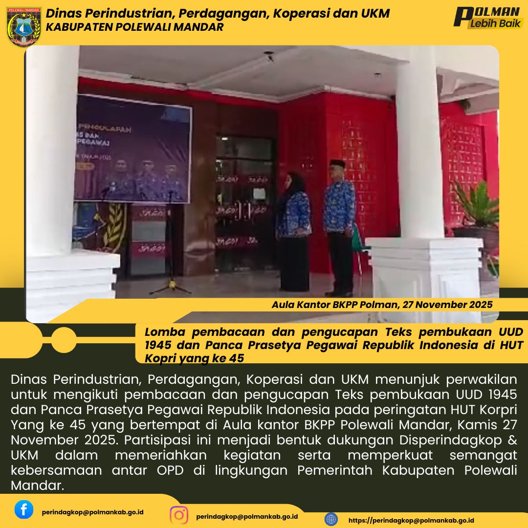 Dinas Perindustrian, Perdagangan, Koperasi dan UKM menunjuk perwakilan untuk mengikuti pembacaan dan pengucapan Teks pembukaan UUD 1945 dan Panca Prasetya Pegawai Republik Indonesia pada peringatan HUT Korpri Yang ke 45 yang bertempat di Aula kantor BKPP Polewali Mandar, Kamis 27 November 2025. Partisipasi ini menjadi bentuk dukungan Disperindagkop & UKM dalam memeriahkan kegiatan serta memperkuat semangat kebersamaan antar OPD di lingkungan Pemerintah Kabupaten Polewali Mandar....