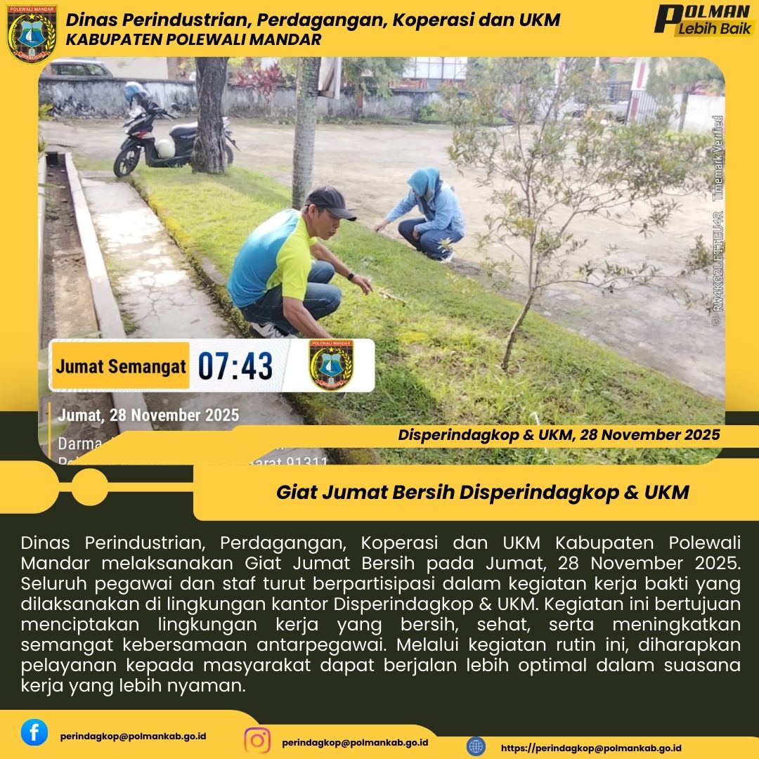 Dinas Perindustrian, Perdagangan, Koperasi dan UKM Kabupaten Polewali Mandar melaksanakan Giat Jumat Bersih pada Jumat, 28 November 2025. Seluruh pegawai dan staf turut berpartisipasi dalam kegiatan kerja bakti yang dilaksanakan di lingkungan kantor Disperindagkop & UKM. Kegiatan ini bertujuan menciptakan lingkungan kerja yang bersih, sehat, serta meningkatkan semangat kebersamaan antarpegawai. Melalui kegiatan rutin ini, diharapkan pelayanan kepada masyarakat dapat berjalan lebih optimal da...