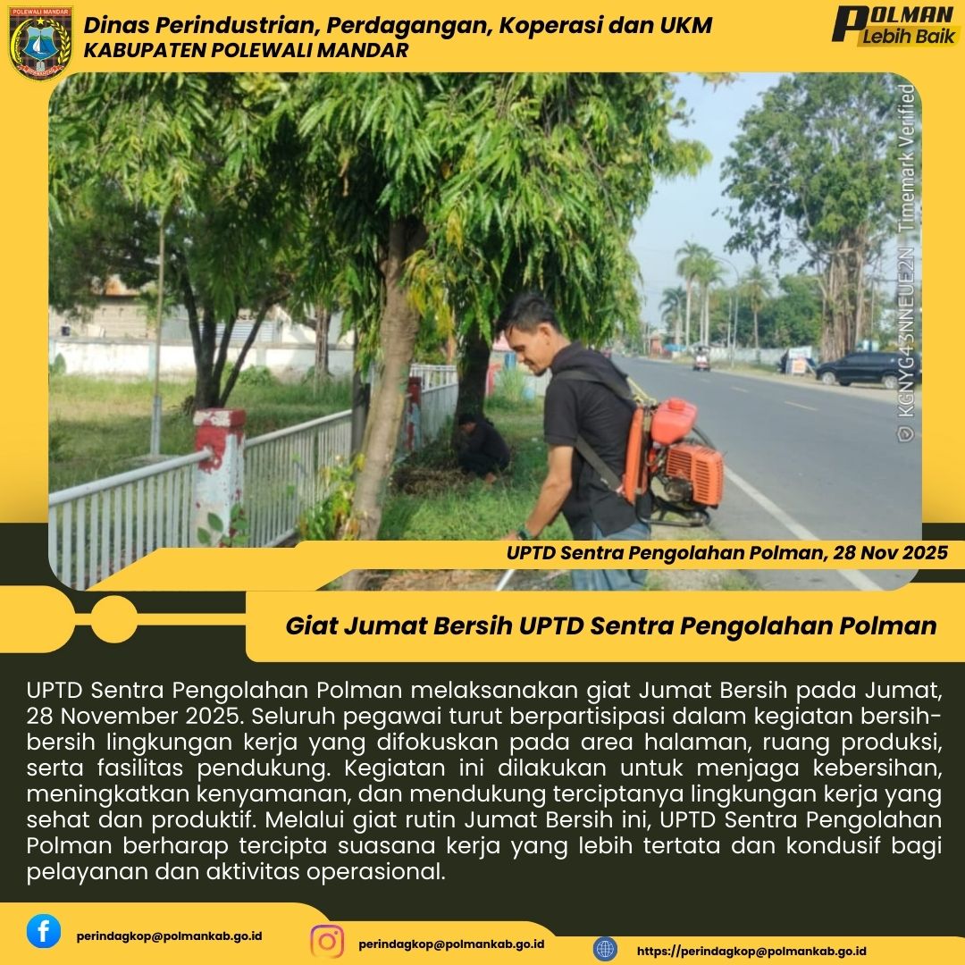 UPTD Sentra Pengolahan Polman melaksanakan giat Jumat Bersih pada Jumat, 28 November 2025. Seluruh pegawai turut berpartisipasi dalam kegiatan bersih-bersih lingkungan kerja yang difokuskan pada area halaman, ruang produksi, serta fasilitas pendukung. Kegiatan ini dilakukan untuk menjaga kebersihan, meningkatkan kenyamanan, dan mendukung terciptanya lingkungan kerja yang sehat dan produktif. Melalui giat rutin Jumat Bersih ini, UPTD Sentra Pengolahan Polman berharap tercipta suasana kerja yang l...