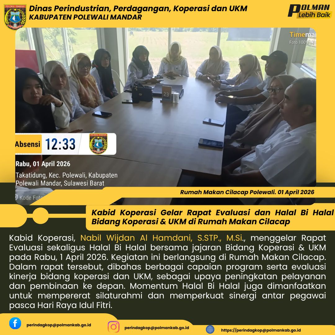Kabid Koperasi, Nabil Wijdan Al Hamdani, S.STP., M.Si., menggelar Rapat Evaluasi sekaligus Halal Bi Halal bersama jajaran Bidang Koperasi & UKM pada Rabu, 1 April 2026. Kegiatan ini berlangsung di Rumah Makan Cilacap. Dalam rapat tersebut, dibahas berbagai capaian program serta evaluasi kinerja bidang koperasi dan UKM, sebagai upaya peningkatan pelayanan dan pembinaan ke depan. Momentum Halal Bi Halal juga dimanfaatkan untuk mempererat silaturahmi dan memperkuat sinergi antar pegawai pasca Hari Raya Idul Fitri....