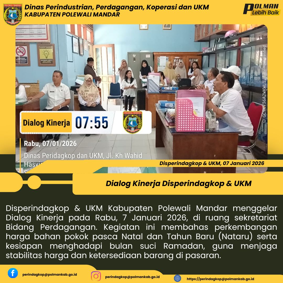 Disperindagkop & UKM Kabupaten Polewali Mandar menggelar Dialog Kinerja pada Rabu, 7 Januari 2026, di ruang sekretariat Bidang Perdagangan. Kegiatan ini membahas perkembangan harga bahan pokok pasca Natal dan Tahun Baru (Nataru) serta kesiapan menghadapi bulan suci Ramadan, guna menjaga stabilitas harga dan ketersediaan barang di pasaran....