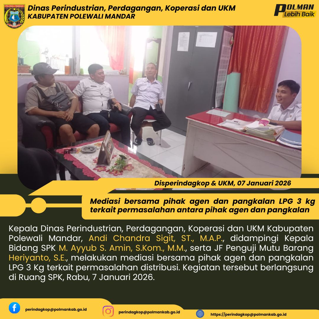 Kepala Dinas Perindustrian, Perdagangan, Koperasi dan UKM Kabupaten Polewali Mandar, Andi Chandra Sigit, ST., M.A.P., didampingi Kepala Bidang SPK M. Ayyub S. Amin, S.Kom., M.M., serta JF Penguji Mutu Barang Heriyanto, S.E., melakukan mediasi bersama pihak agen dan pangkalan LPG 3 Kg terkait permasalahan distribusi. Kegiatan tersebut berlangsung di Ruang SPK, Rabu, 7 Januari 2026....
