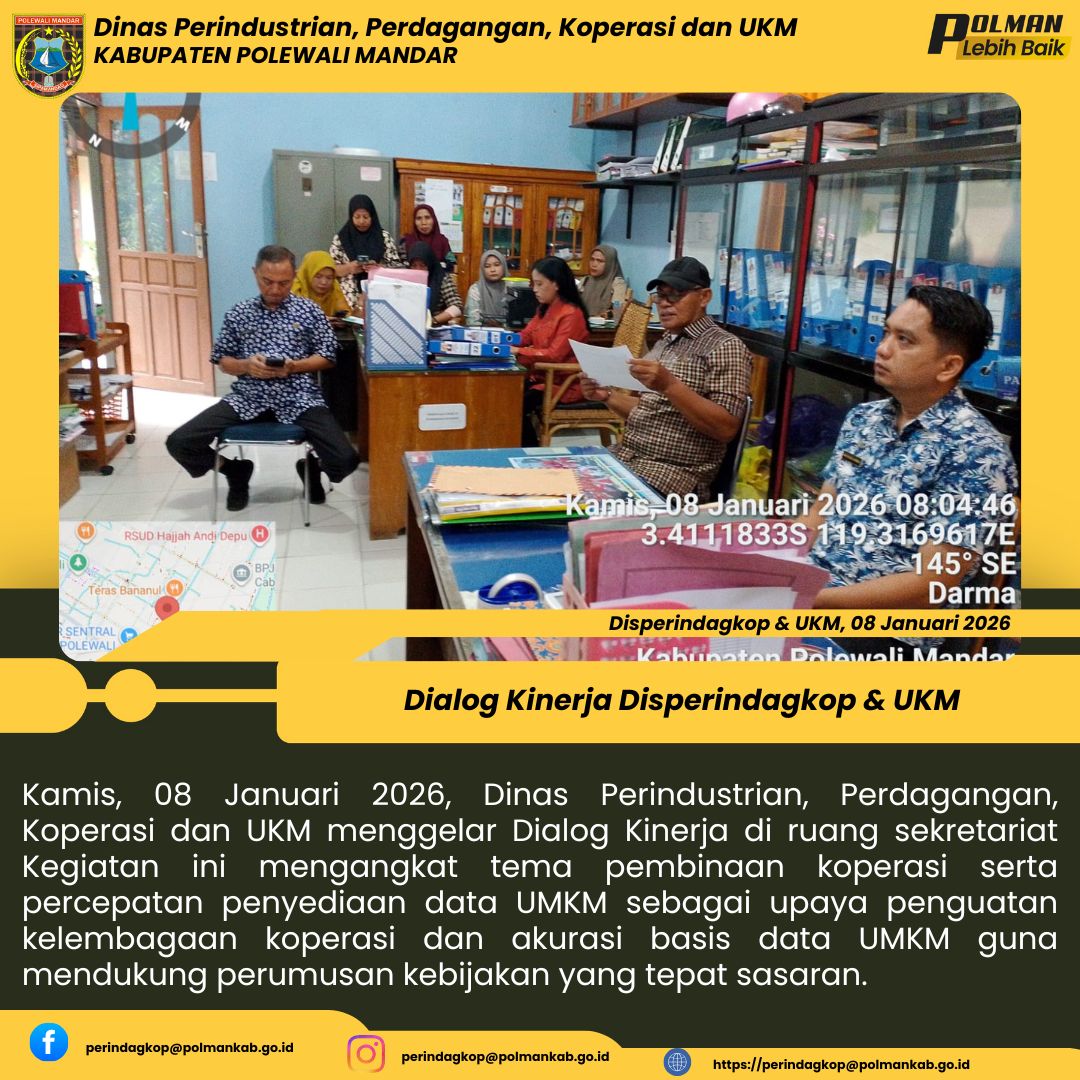 Kamis, 08 Januari 2026, Dinas Perindustrian, Perdagangan, Koperasi dan UKM menggelar Dialog Kinerja di ruang sekretariat Kegiatan ini mengangkat tema pembinaan koperasi serta percepatan penyediaan data UMKM sebagai upaya penguatan kelembagaan koperasi dan akurasi basis data UMKM guna mendukung perumusan kebijakan yang tepat sasaran....