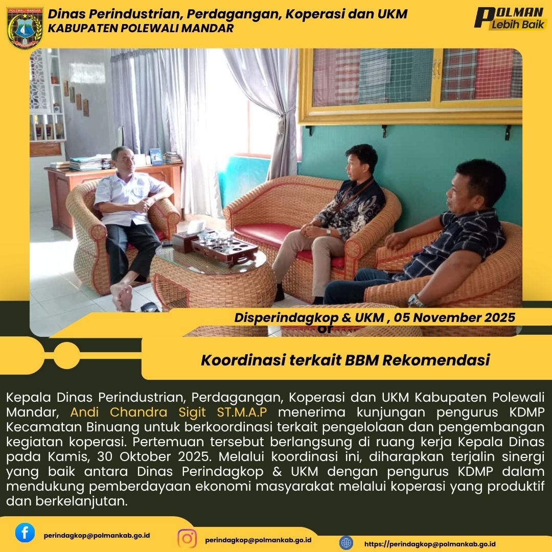 Kepala Dinas Perindustrian, Perdagangan, Koperasi dan UKM Kabupaten Polewali Mandar, Andi Chandra Sigit ST.M.A.P menerima kunjungan pengurus KDMP Kecamatan Binuang untuk berkoordinasi terkait pengelolaan dan pengembangan kegiatan koperasi. Pertemuan tersebut berlangsung di ruang kerja Kepala Dinas pada Kamis, 30 Oktober 2025. Melalui koordinasi ini, diharapkan terjalin sinergi yang baik antara Dinas Perindagkop & UKM dengan pengurus KDMP dalam mendukung pemberdayaan ekonomi masyarakat melalui koperasi yang produktif dan berkelanjutan....