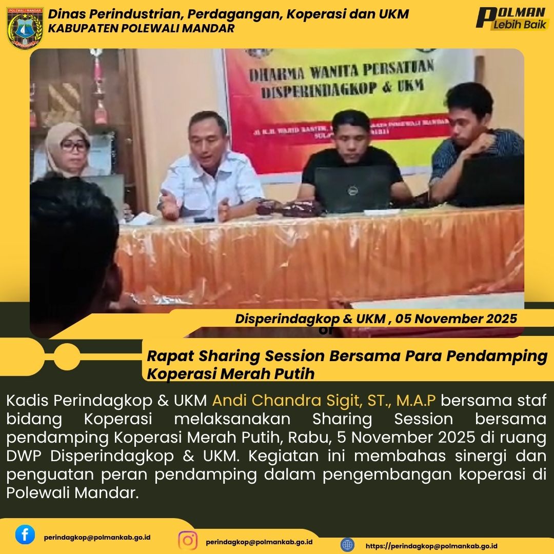 Kadis Perindagkop & UKM Andi Chandra Sigit, ST., M.A.P bersama staf bidang Koperasi melaksanakan Sharing Session bersama pendamping Koperasi Merah Putih, Rabu, 5 November 2025 di ruang DWP Disperindagkop & UKM. Kegiatan ini membahas sinergi dan penguatan peran pendamping dalam pengembangan koperasi di Polewali Mandar....