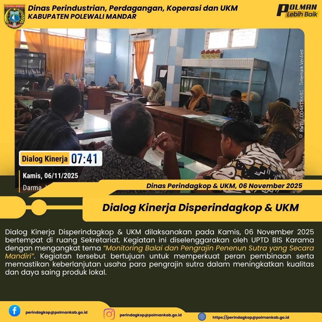 Dialog Kinerja Disperindagkop & UKM dilaksanakan pada Kamis, 06 November 2025 bertempat di ruang Sekretariat. Kegiatan ini diselenggarakan oleh UPTD BIS Karama dengan mengangkat tema “Monitoring Balai dan Pengrajin Penenun Sutra yang Secara Mandiri”. Kegiatan tersebut bertujuan untuk memperkuat peran pembinaan serta memastikan keberlanjutan usaha para pengrajin sutra dalam meningkatkan kualitas dan daya saing produk lokal....