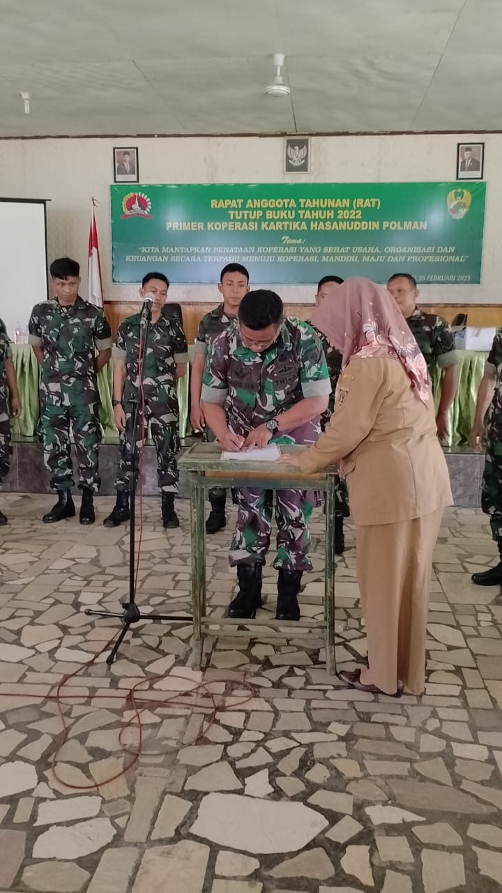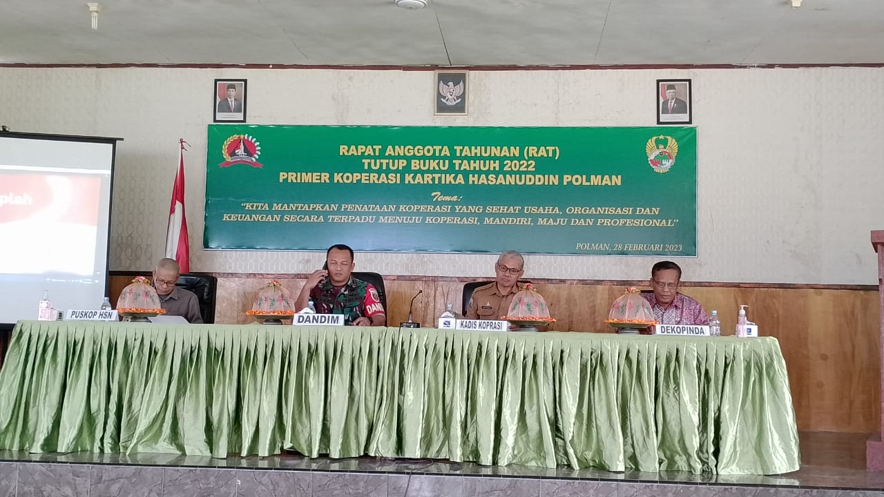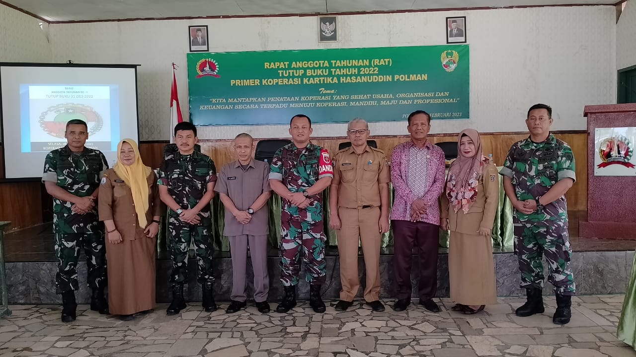Selasa, 28 Februari 2023, Bidang Koperasi Disperindagkop Ukm Polewali Mandar, Menghadiri Rapat Anggota Tahunan (RAT) Tutup Buku Tahun 2022 Primer Koperasi Kartika Hasanuddin Polman, di Baruga Kodim 1402/Polman, Dengan Tema “Kita Mantapkan Penetapan Koperasi yang Sehat Usaha, Organisasi dan Keuangan secara Terpadu menuju Koperasi, Mandiri, Maju dan professional”.
