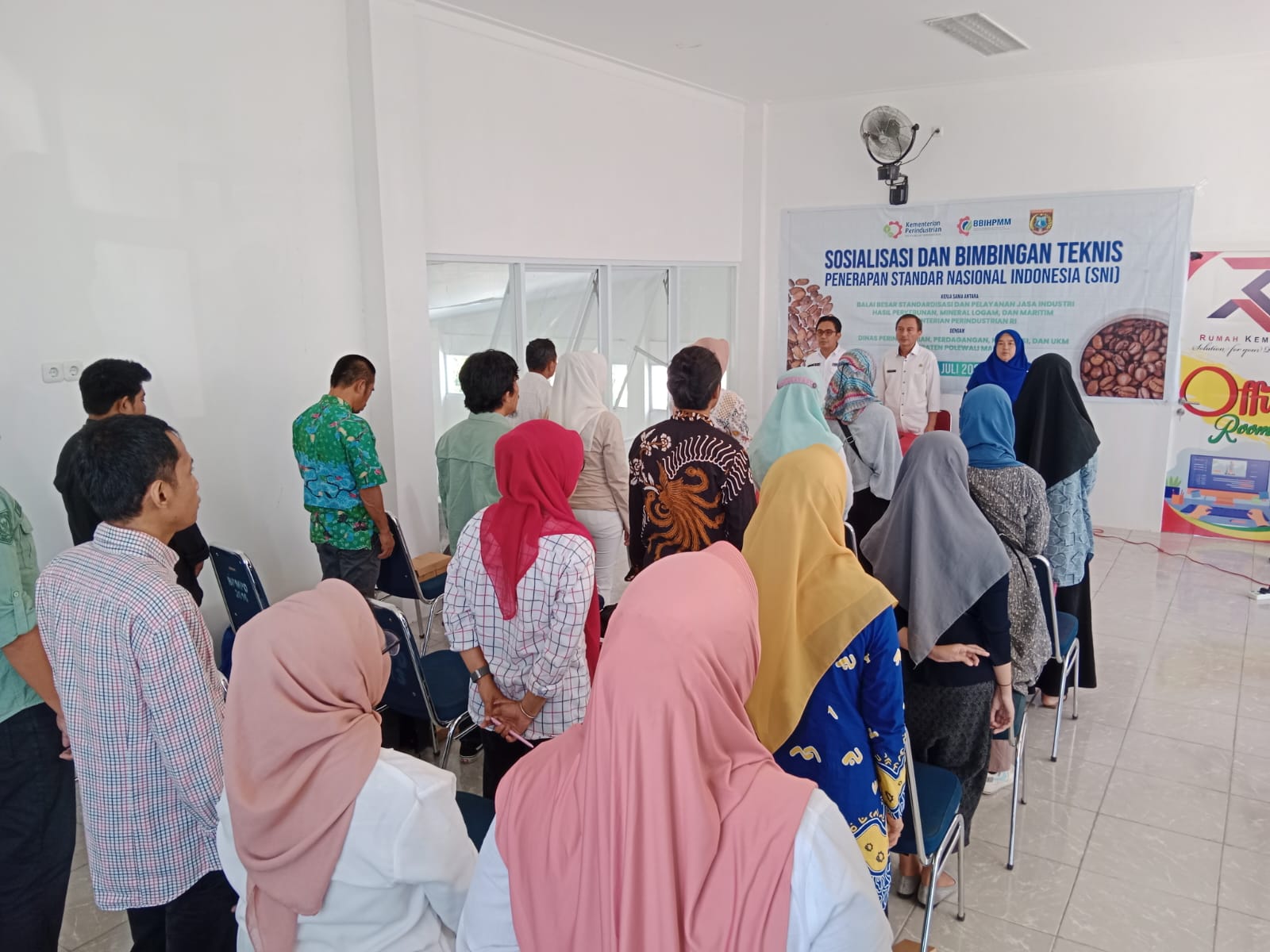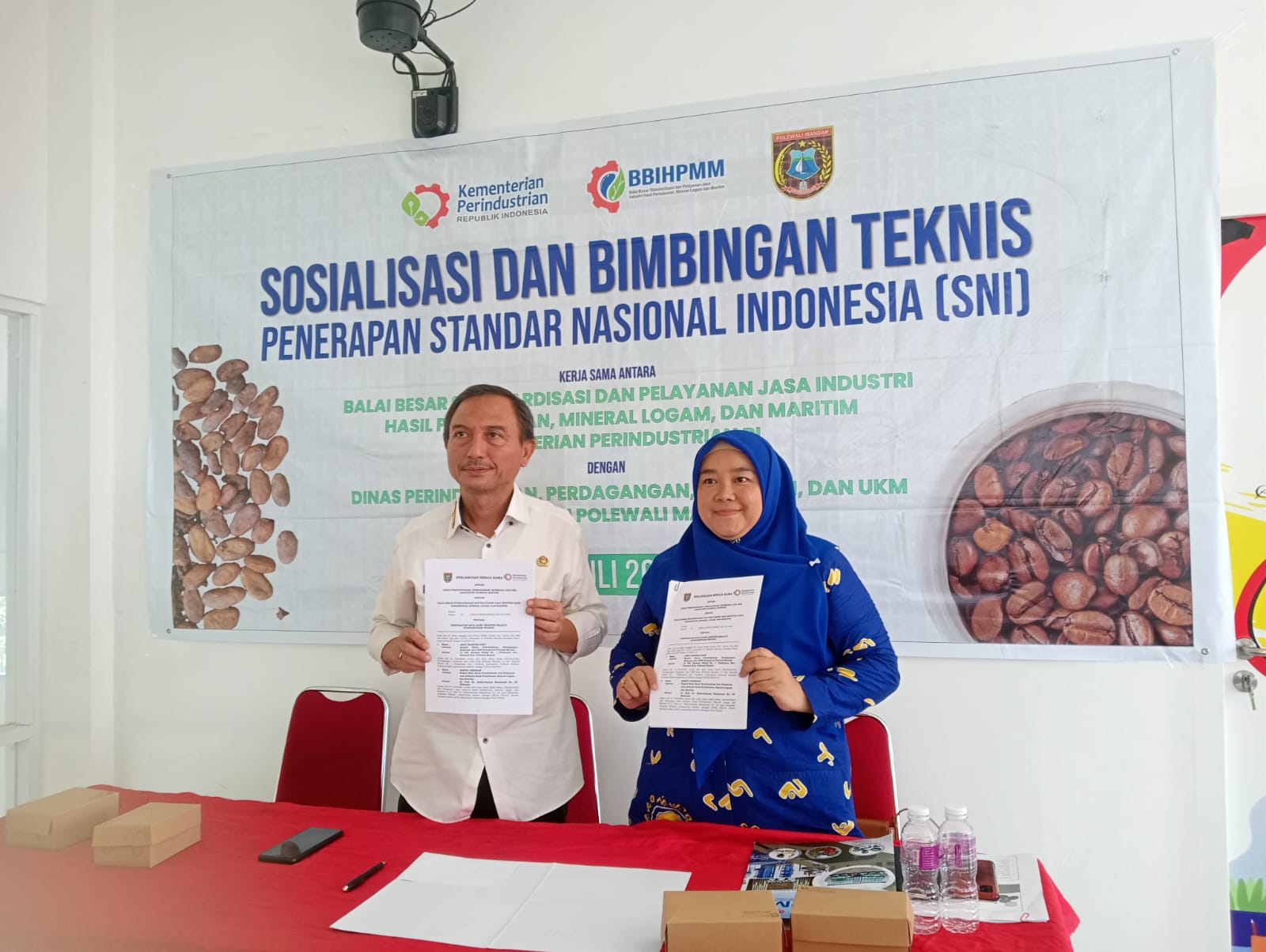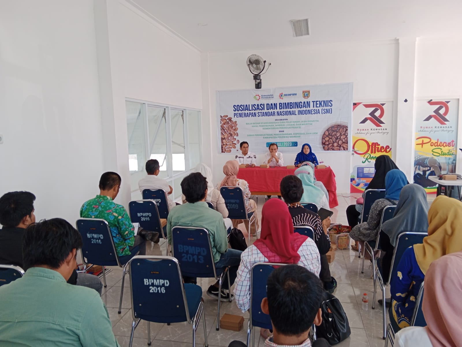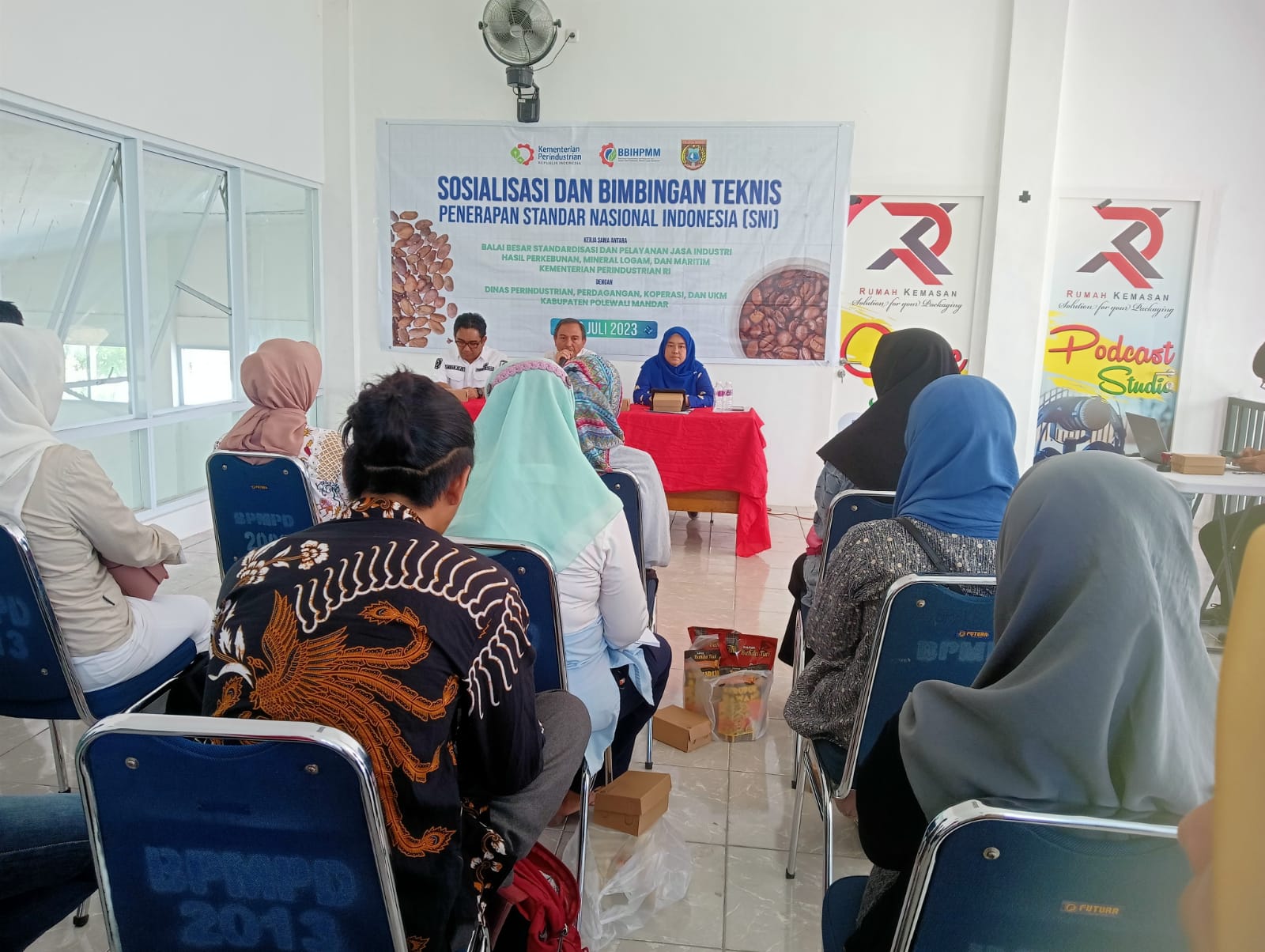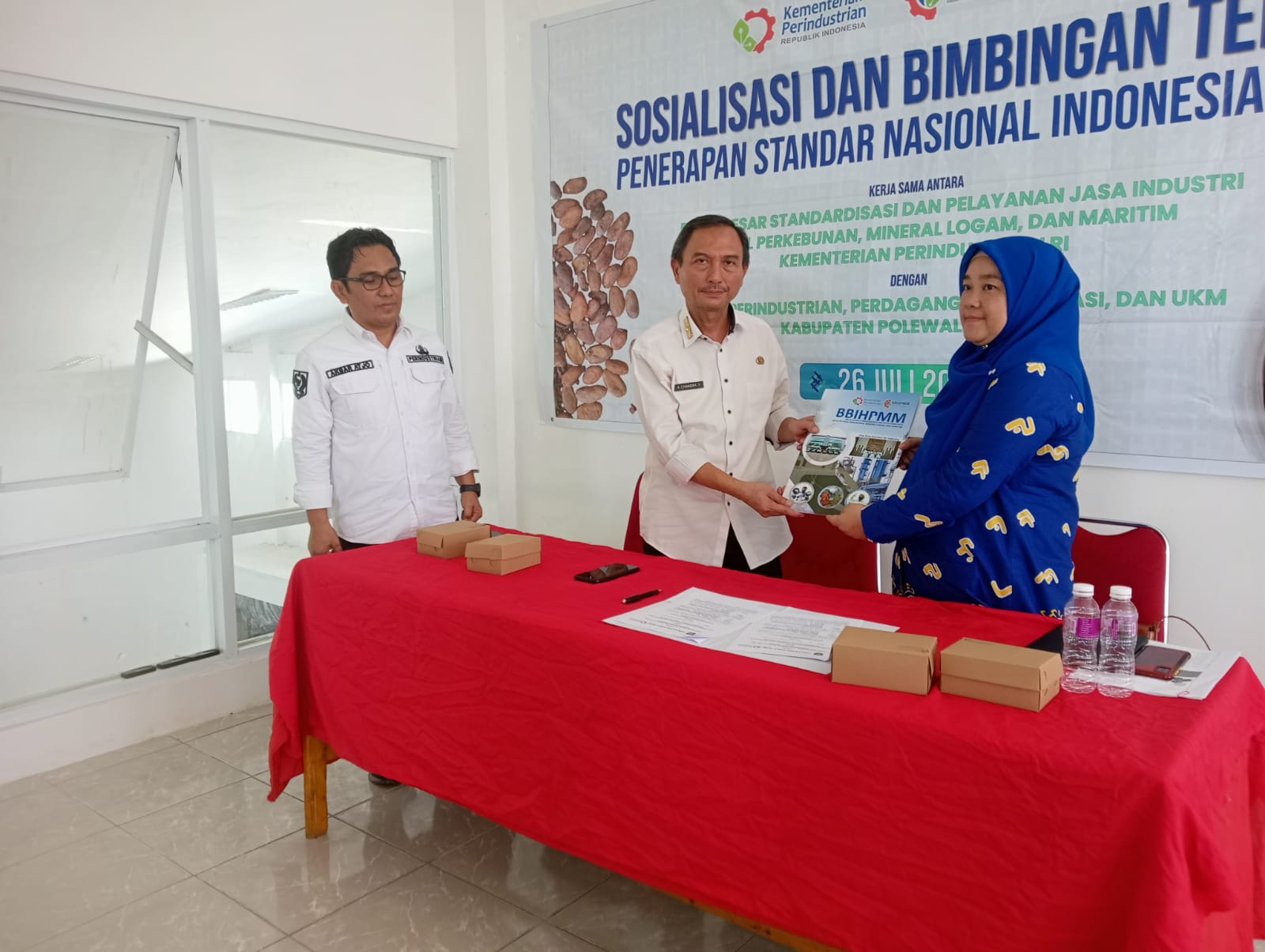 Kegiatan Sosialisasi dan Bimbingan Teknis Penerapan Standar Nasional Indonesia (SNI), Bekerja sama dengan, Balai Besar Standardisasi dan Pelayanan Jasa Industri Hasil Perkebunan Mineral Logam, dan Maritim Kementerian Perindustrian Dengan Dinas Perindagkop dan UKM Kabupaten Polewali Mandar, Rabu 26 Juli 2023, di Rumah Kemasan Disperindagkop dan UKM Takatidung, Polewali, Kabupaten Polewali Mandar, Sulawesi Barat.