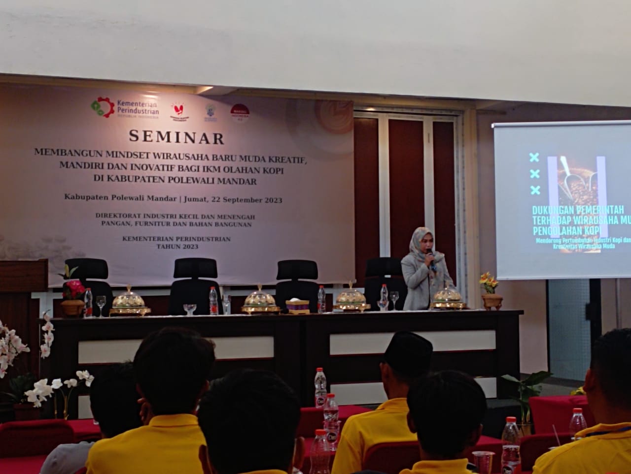 Wiwin Wulandari S.S.IP selaku Ka.UPTD Sentra Pengolahan Disperindagkop Ukm Polewali Mandar Membawakan Materi Pada Kegiatan Seminar Membangun Mendset Wirausaha Baru Muda Kretif, Mandiri dan Inovatif Bagi IKM Olahan Kopi di Kabupaten Polewali Mandar, Jumat 22 September 2023, Bertempat di Aula Sinas Mas Polewali Mandar.